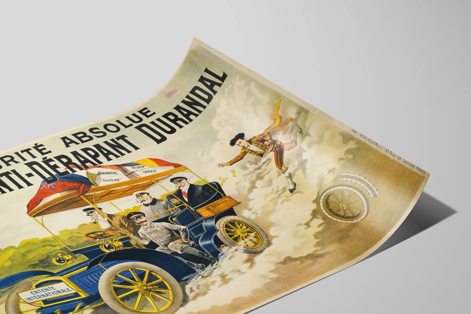 Dieses Vintage-Poster zeigt eine alte Werbung für den Rutschhemmstoff Durandal, ein Produkt zur Fahrzeugsicherheit. Mit einem typischen grafischen Stil der Werbeplakate des frühen 20. Jahrhunderts präsentiert diese Wanddekoration ein altes Auto mit vier elegant gekleideten Figuren, das Ihrer Inneneinrichtung einen klassischen und zugleich eleganten Charme verleiht. Das Auto, in Blau- und Gelbtönen gehalten, wird von einer Aufschrift begleitet, die die absolute Sicherheit durch diesen Rutschhemmstoff preist. Mehrere Flaggen, die über dem Fahrzeug wehen, symbolisieren die Internationale Ausrichtung des Produkts und vermitteln eine weltweite Reichweite sowie das Vertrauen einer internationalen Verständigung. Die Dynamik und Bewegung werden durch den Rauch und die Figur des Toreros angedeutet, der scheinbar seinen Hut und seinen Fuß verloren hat, was metaphorisch die Kraft und Wirksamkeit des Rutschhemmstoffs Durandal illustriert. Dieses Poster ist ein perfektes Wanddekorationselement für Liebhaber von Vintage und Retro-Werbung, die ihrer Einrichtung einen Hauch Geschichte und alten Charme verleihen möchten. Ob im Büro, Wohnzimmer oder einer Sammlung von Werbeplakaten – es wird die Aufmerksamkeit auf sich ziehen und gleichzeitig eine Geschichte erzählen durch seine klassische Illustration und sorgfältiges Design. Ein echtes Werbebild, das Kunst und Kommunikation verbindet, ideal, um eine Atmosphäre mit einem Thema rund um Sicherheit, Automobil und die aufstrebende Industrie des frühen 20. Jahrhunderts zu bereichern.