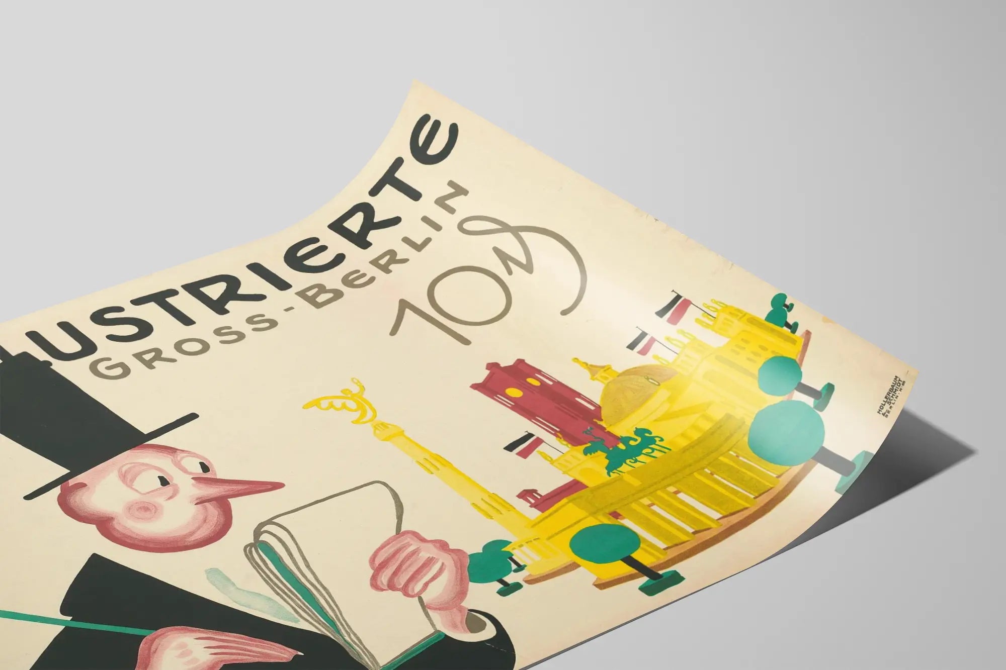 Le fond beige clair laisse toute la place au dessin et au texte, où le titre en lettres majuscules « DIE ILLUSTRIERTE FÜR GROSS-BERLIN » domine la partie supérieure. Le lettrage, simple mais efficace, contribue à la lisibilité et à l'impact visuel de cette décoration murale qui capte immédiatement l'attention. Le style graphique est caractéristique des affiches publiitaires du début du 20e siècle, mêlant modernisme et légèreté humoristique.