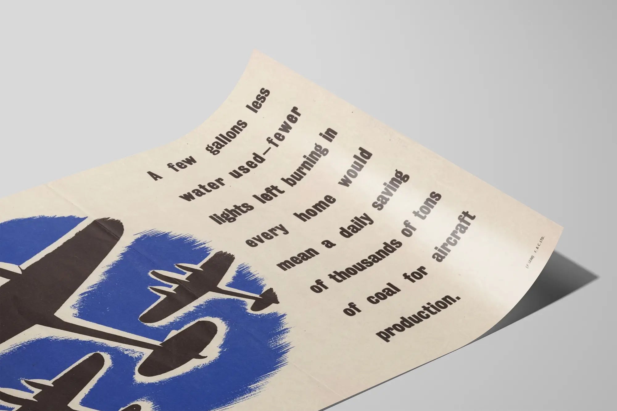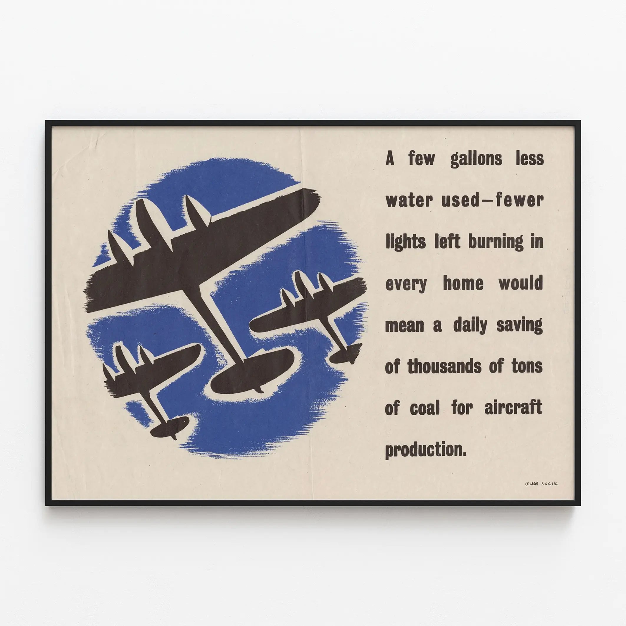 Cette affiche vintage met en avant un message fort sur l'économie des ressources naturelles, illustré par la silhouette de trois avions en vol sur un fond bleu stylisé. Le texte en anglais souligne l'importance de réduire la consommation d'eau et d'éteindre les lumières inutiles à la maison, rappelant que ces gestes simples pourraient permettre d'économiser chaque jour des milliers de tonnes de charbon utilisées pour la production d'avions. Ce poster, avec son style graphique épuré et ses couleurs contrastées, est une pièce idéale pour une décoration murale à la fois esthétique et porteuse d'un message écologique. Parfait pour les amateurs de décoration murale vintage ou pour ceux qui souhaitent sensibiliser à la conservation des ressources, ce tableau met en avant un design rétro associant un message environnemental avec une illustration symbolique de l'aéronautique. Cette affiche décorative apporte une touche d'authenticité et d'engagement à votre intérieur, tout en évoquant un moment historique où l'économie d'énergie était un enjeu majeur. Elle s'insère facilement dans divers styles d'ambiance, du loft industriel à la décoration moderne. En choisissant cette affiche, vous optez pour un support de décoration murale qui allie le style graphique old school à une réflexion sur l'impact des petits gestes quotidiens sur la consommation énergétique globale. Un objet de décoration murale charmant et significatif qui invite à la prise de conscience tout en apportant une touche vintage à vos espaces.