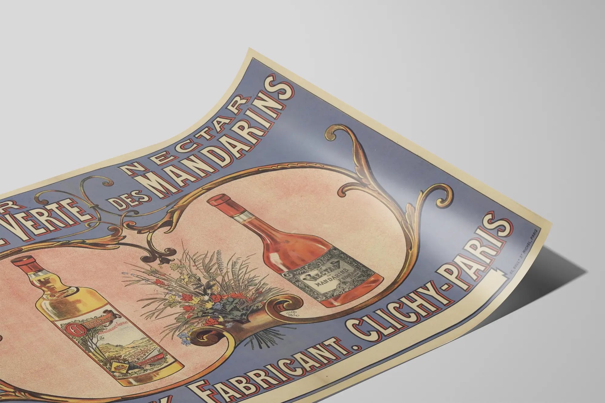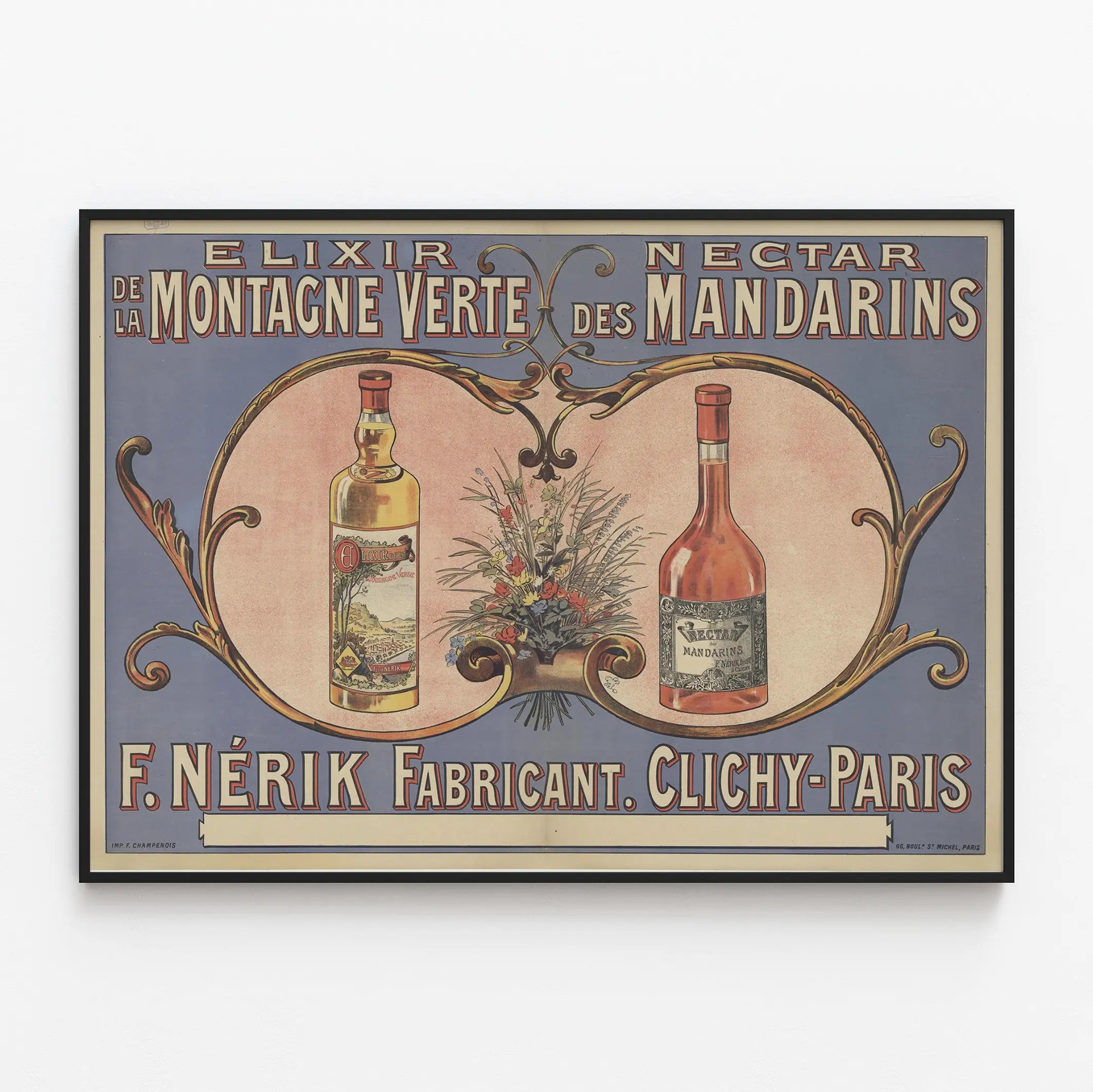 Découvrez cette affiche vintage publicitaire mettant en avant deux célèbres produits : l'Elixir de la Montagne Verte et le Nectar des Mandarins, tous deux signés F. Nérik, fabricant à Clichy-Paris. Cette décoration murale de style ancien revisite avec authenticité l'esprit des affiches publicitaires du début du 20e siècle. Sur un fond aux tons doux mêlant bleu et rose, cette affiche présente deux bouteilles élégamment dessinées encadrées dans des motifs ornés rappelant un style Art Nouveau. La première bouteille d'Elixir de la Montagne Verte est illustrée avec un décor naturel représentant une montagne et une campagne, évoquant la fraîcheur et la qualité des ingrédients. La deuxième bouteille, le Nectar des Mandarins, affiche une couleur chaude qui contraste avec l'arrière-plan tout en apportant une touche gourmande à la composition. Entre les deux bouteilles, un bouquet de fleurs délicatement détaillé ajoute une note de raffinement et équilibre visuellement cette création artistique. Signée 'F. Nérik Fabricant, Clichy-Paris', cette affiche est un excellent choix pour embellir un intérieur avec une décoration murale évocatrice du patrimoine publicitaire français. Elle s’intègre parfaitement dans un salon, une cuisine ou un espace dédié aux boissons et saveurs, apportant une ambiance rétro chic. Ce poster, avec son imprimé aux caractères typographiques forts et bien lisibles, sublimera vos murs tout en racontant l'histoire de ces nectars traditionnels. Idéale pour les amateurs de décoration murale vintage et les collectionneurs d'affiches anciennes, cette œuvre est un véritable hommage au savoir-faire artisanal et à l'esthétique publicitaire d'époque.