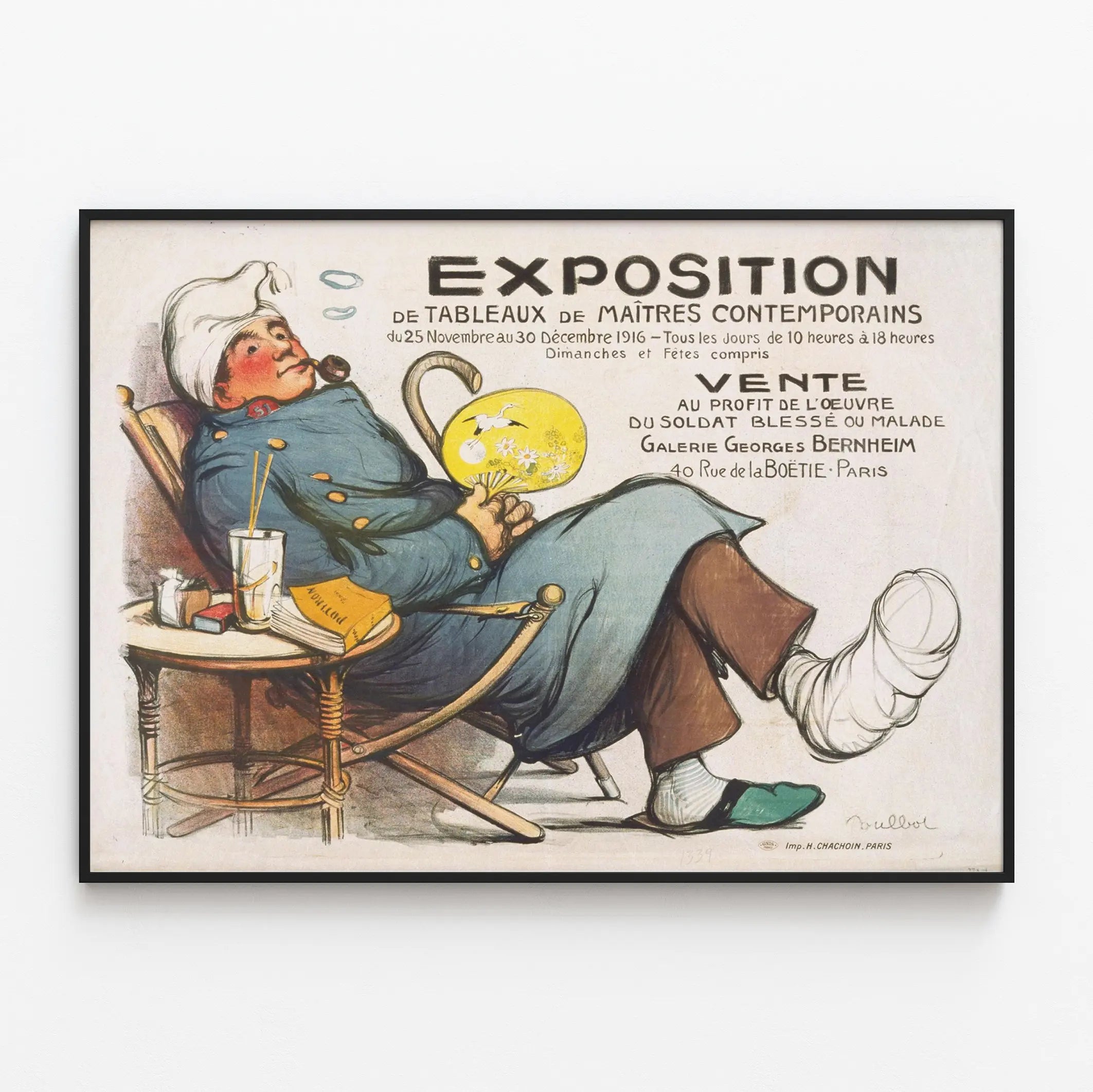 Découvrez cette affiche vintage exceptionnelle qui annonce une exposition de tableaux de maîtres contemporains, organisée à Paris en 1916. Ce poster publicitaire se démarque par son illustration détaillée représentant un soldat blessé, assis dans un fauteuil, symbole de l'œuvre caritative en faveur des soldats blessés ou malades. L'événement se déroulait à la Galerie Georges Bernheim, située au 40 rue de la Boétie, un lieu emblématique pour les amateurs d'art et de décoration murale du début du XXe siècle.