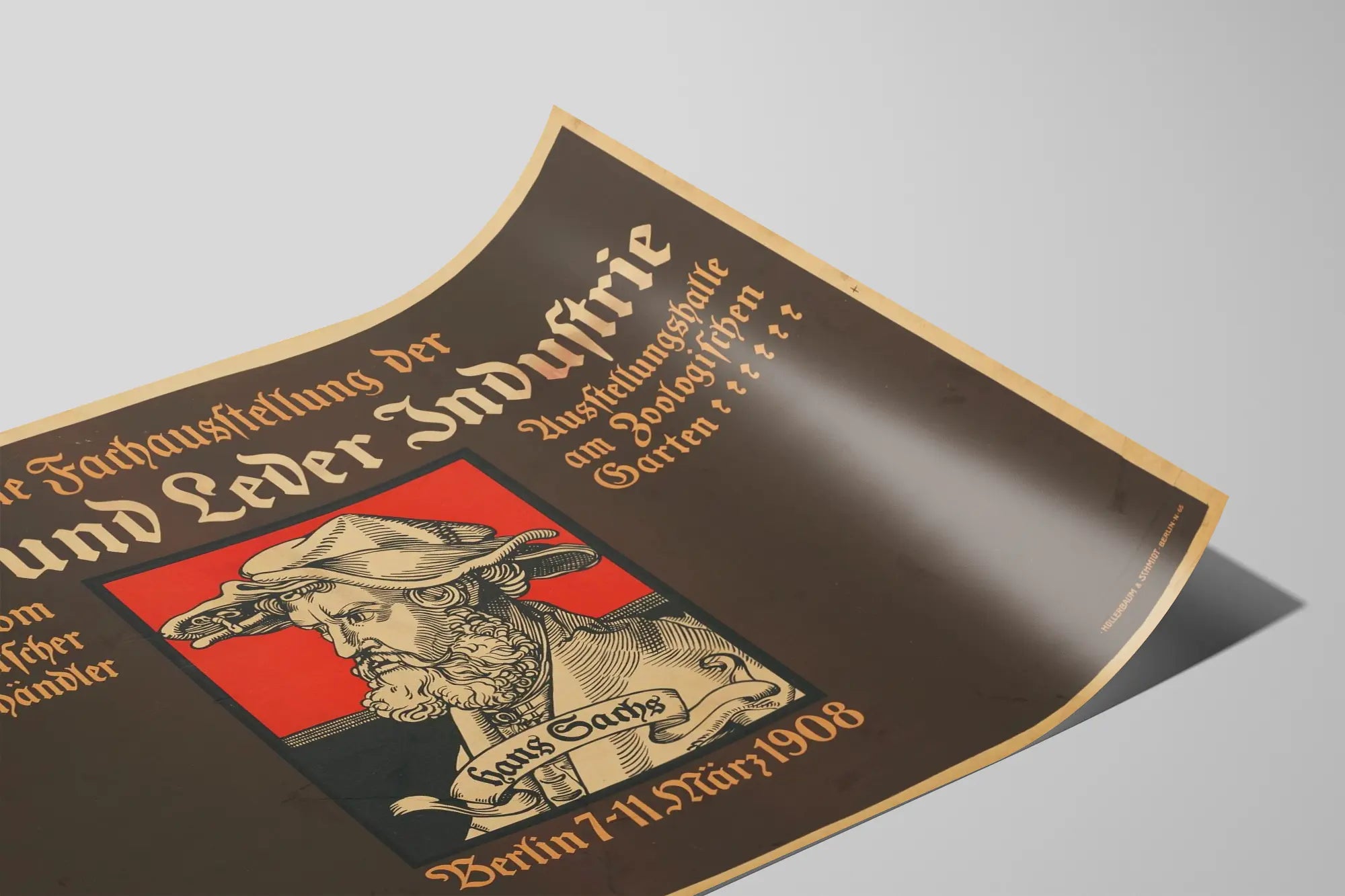 Découvrez cette affiche vintage exceptionnelle dédiée à la troisième exposition spécialisée de l'industrie de la chaussure et du cuir, qui s'est tenue à Berlin du 7 au 11 mars 1908. Cette décoration murale originale offre un regard artistique sur un événement historique, mettant en valeur le savoir-faire et l'importance économique du secteur du cuir et de la chaussure au début du XXe siècle. L'affiche présente une illustration centrale stylisée d'un homme barbu coiffé d'un couvre-chef, avec un fond rouge vif qui attire immédiatement le regard, encadré d'un marron profond, offrant un contraste saisissant. Le texte en typographie gothique exprime toute l'authenticité et le style graphique de l'époque, avec des inscriptions en allemand qui soulignent le thème de l'exposition et son lieu, la salle d'exposition du Jardin zoologique de Berlin. Cette pièce est idéale pour les amateurs de décoration murale vintage, les passionnés d'histoire industrielle ou les collectionneurs d'affiches anciennes. Que ce soit pour un salon, un bureau ou un espace dédié à la culture et au design, ce poster vintage apporte une touche unique et intemporelle. Il met en avant non seulement un aspect du patrimoine industriel allemand, mais aussi un élément de décoration murale à la fois sobre et puissant, qui évoque l'histoire avec élégance. Ce tableau mural, reproduit en haute qualité, saura devenir un point focal dans votre intérieur et enrichir votre décoration avec une ambiance rétro et culturelle. Apportez une atmosphère authentique et riche d'histoire à votre espace avec ce poster vintage d'exposition dédié à l'industrie de la chaussure et du cuir, symbole d'un passé artisanal et industriel valorisé par une mise en image graphique et typographique remarquable.