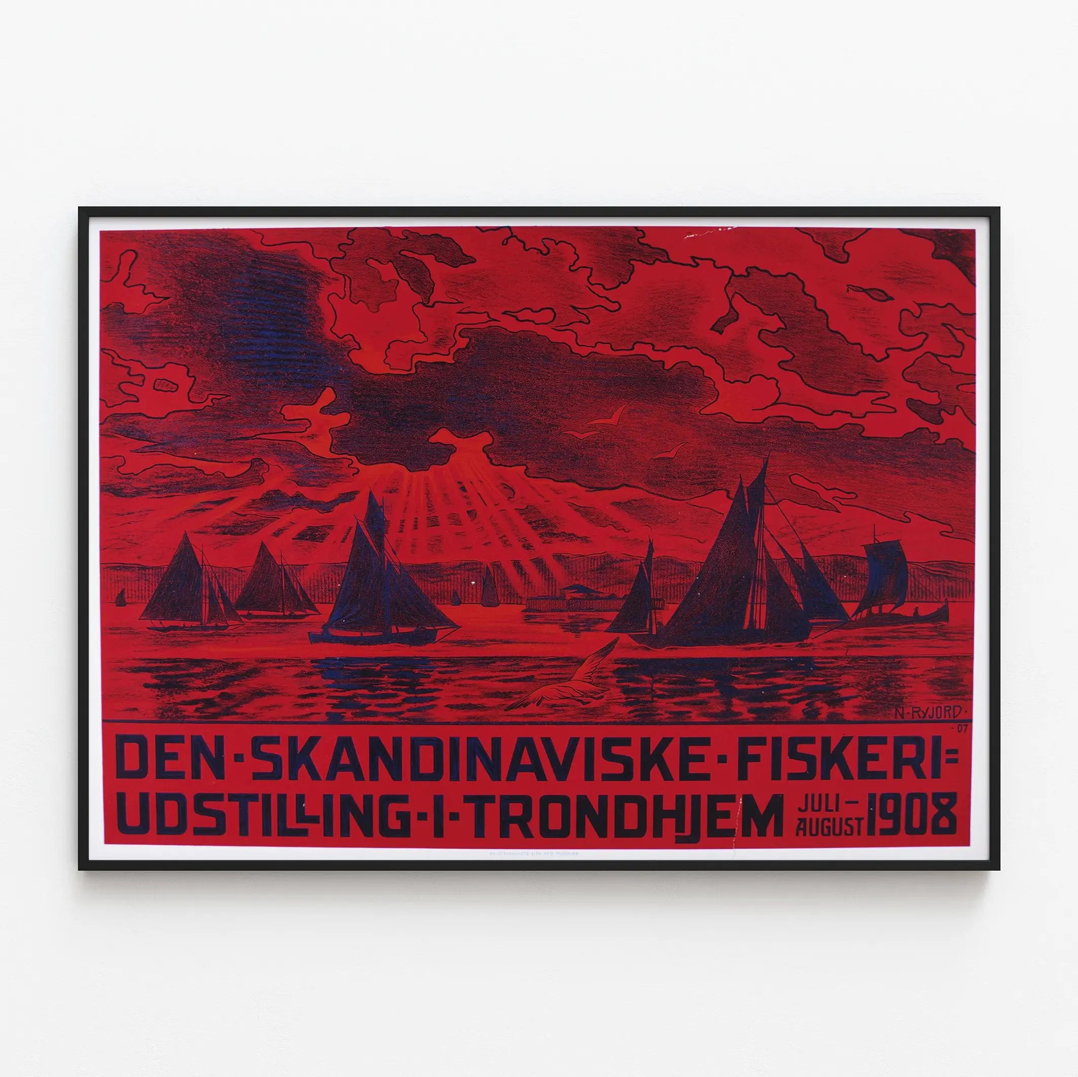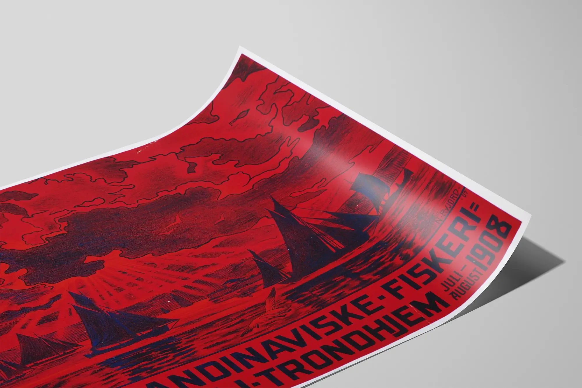 Cette affiche vintage intitulée « Den Skandinaviske Fiskeri Udstilling i Trondhjem 1908 » est une pièce unique pour la décoration murale, évoquant une exposition scandinave dédiée à la pêche qui s'est tenue à Trondheim en 1908. L'affiche se démarque par sa palette de couleurs étonnante, principalement dominée par un rouge profond avec des silhouettes noires, créant un contraste fort et captivant. On y voit plusieurs voiliers naviguant sur une mer calme sous un ciel dramatique avec des rayons de soleil perçant les nuages et des mouettes en vol, ce qui apporte une atmosphère maritime authentique et nostalgique. Le style graphique, typique des affiches du début du XXe siècle, combine des lignes précises et un rendu nuancé des textures, illustrant une scène animée tout en conservant une esthétique épurée et élégante. Cette décoration murale est idéale pour les amateurs d'art vintage et d'histoire maritime, mais aussi pour ceux souhaitant ajouter une touche d'authenticité scandinave à leur intérieur. En tant que poster, elle apporte une dynamique visuelle unique, parfaite pour orner un salon, un bureau ou un espace dédié à la culture nordique. Ce tableau mural représente non seulement un événement historique mais aussi un hommage à la tradition pêcheuse scandinave, enrichissant ainsi tout espace de vie par son récit visuel et son identité forte. Une affiche incontournable pour les collectionneurs et passionnés de décoration murale à la recherche d'un objet original mêlant art, histoire et design.