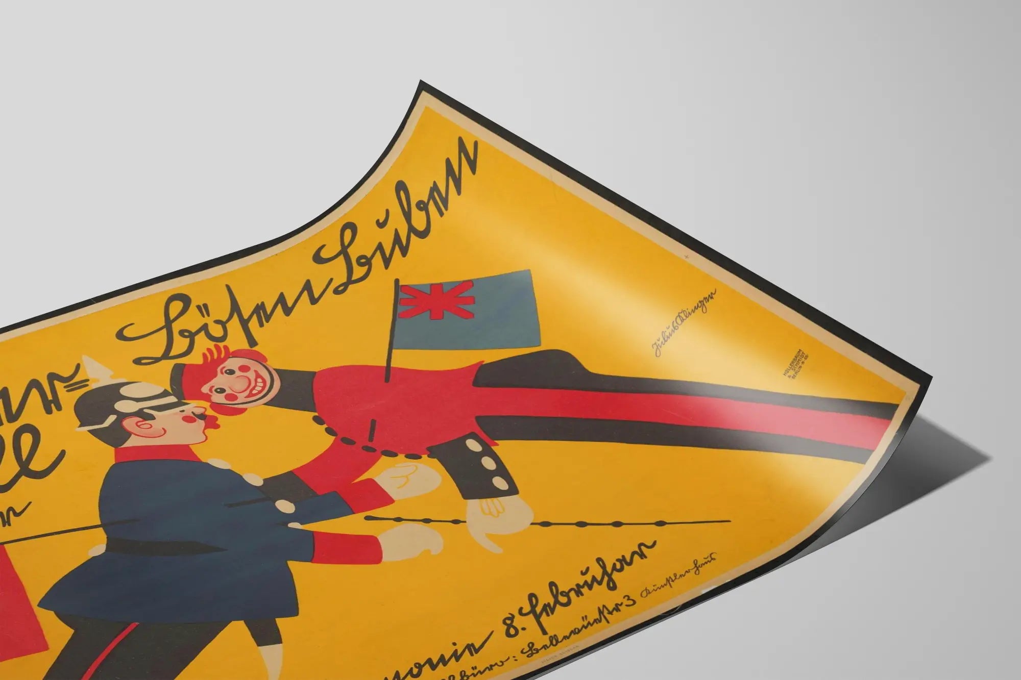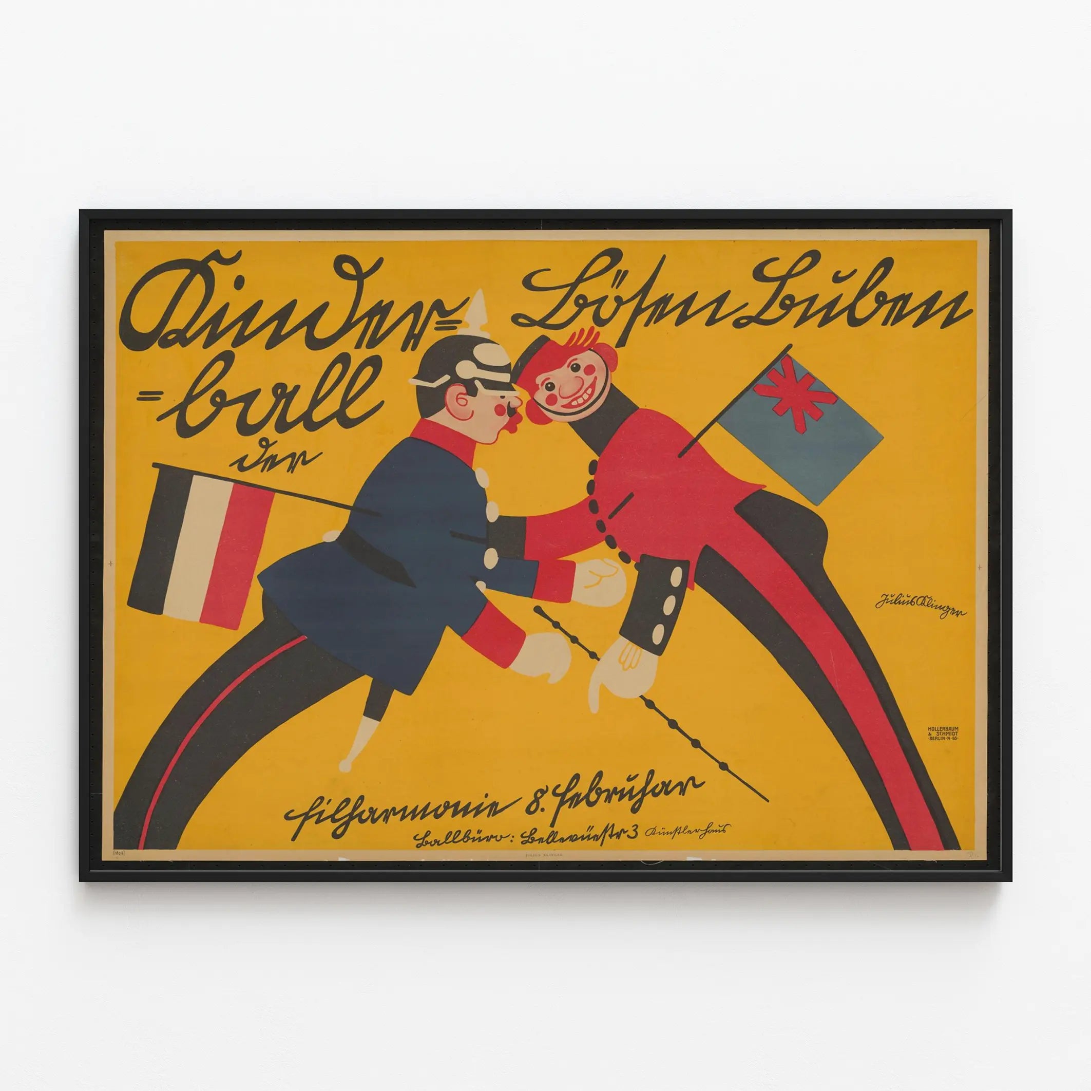 Cette affiche vintage Kinderball Der Bosen Buben est une pièce remarquable de décoration murale aux couleurs vives et contrastées, dominée par un fond jaune éclatant qui attire immédiatement le regard. Elle illustre deux personnages caricaturaux aux traits exagérés, vêtus de costumes militaires : l'un porte un uniforme bleu avec un casque et une moustache, tandis que l'autre arbore un vêtement rouge avec un large sourire et des joues rougies. Chacun des personnages tient un drapeau, symbolisant deux nations différentes, accentuant l'aspect humoristique et satirique de cette composition graphique. Le texte présent sur l'affiche est stylisé en écriture manuscrite fluide, ajoutant une touche d'authenticité et d'époque à cette création. Signée par Julius Klinger, cette œuvre reflète un style artistique distinctif qui combine l'illustration humoristique avec une mise en page dynamique et colorée. Cette affiche est idéale pour une décoration murale originale, qu'elle soit exposée dans un salon, un bureau ou une pièce dédiée à l'art et au design graphique. Elle apporte une touche de nostalgie et un contraste saisissant dans un intérieur contemporain, tout en racontant une histoire visuelle forte. Parfaite pour les amateurs d'affiches historiques et de posters aux couleurs saturées, cette décoration murale peut être intégrée dans divers styles de décoration, du vintage au moderne, pour créer un point focal attrayant. Sa forte personnalité graphique en fait un choix décoratif audacieux qui ne passera pas inaperçu.