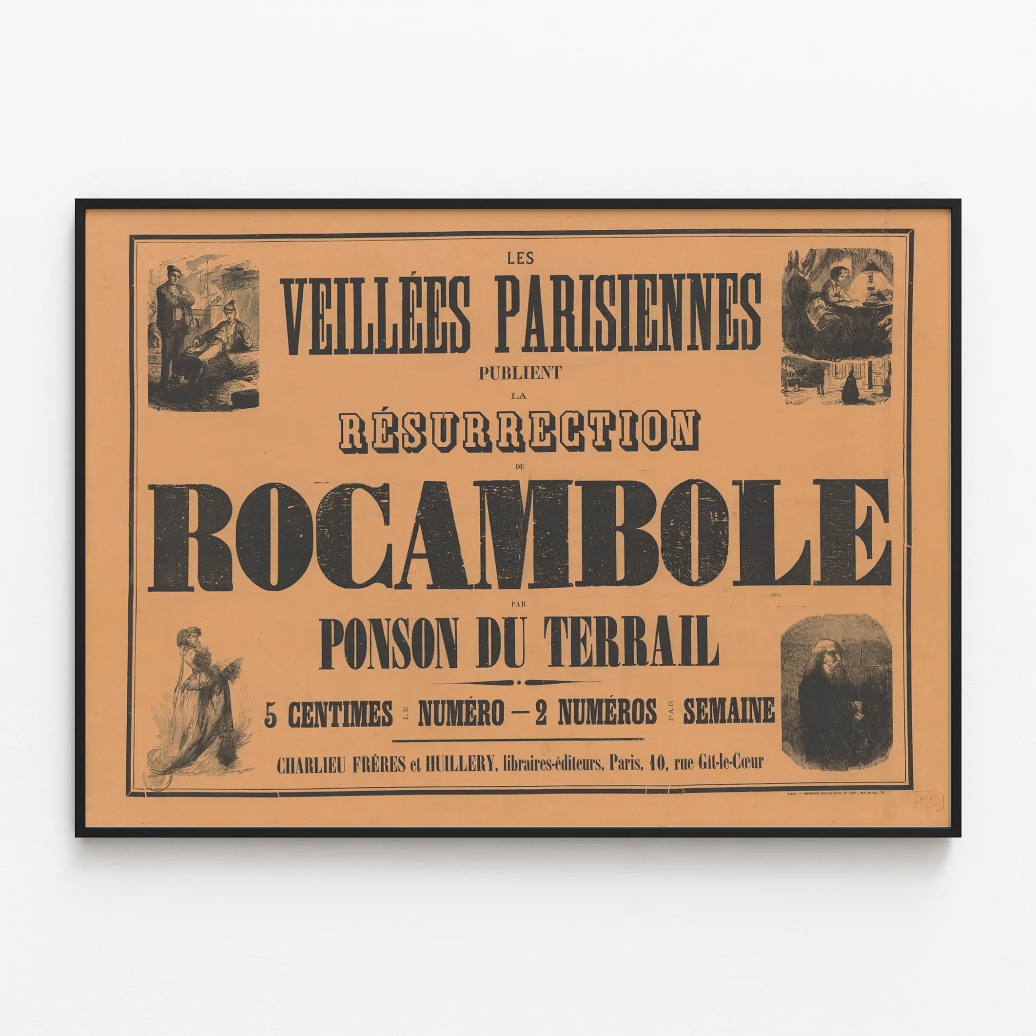 Cette affiche ancienne publicitaire pour la publication « Les Veillées Parisiennes » présente la « Résurrection de Rocambole » par Ponson du Terrail, une œuvre emblématique de la littérature populaire française. Avec son texte typographique imposant et ses illustrations en noir sur fond ocre, cette affiche est un exemple marquant de décoration murale vintage. Elle offre une esthétique authentique, idéale pour les passionnés de décoration murale et d’histoire du livre. Les illustrations d’époque, visibles en quadrants autour du titre principal, apportent un charme supplémentaire et un caractère narratif à cette affiche. Que ce soit pour un salon, une bibliothèque ou une pièce dédiée à la lecture, ce poster apportera une touche d’élégance rétro et culturelle. Cette affiche peut aussi séduire les amateurs de motifs graphiques typiques du XIXe siècle et ceux qui souhaitent intégrer un élément décoratif unique, à la fois littéraire et visuel. Son format et la qualité de sa composition en font un support de décoration murale parfait pour créer une ambiance vintage et littéraire dans un intérieur contemporain ou classique. Un choix idéal pour enrichir la décoration avec un style authentique et chargé d’histoire.