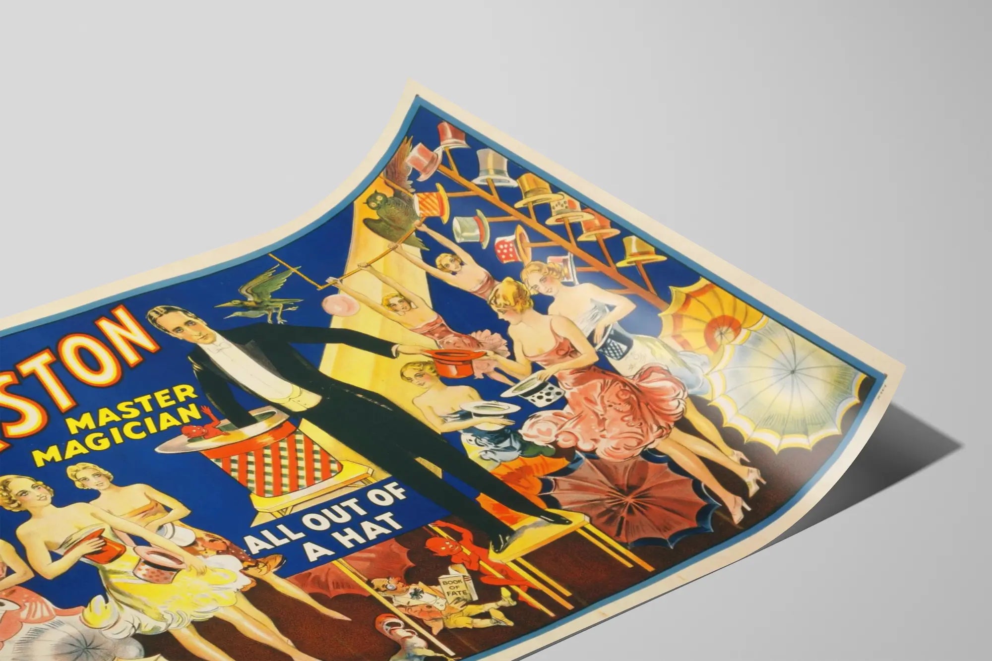 Découvrez cette affiche vintage mettant en scène Thurston, maître magicien, dans une composition riche et colorée idéale pour une décoration murale d'inspiration rétro. Cette illustration publicitaire présente Thurston en costume noir élégant, debout sur un tabouret, effectuant un tour de magie avec un chapeau classique d'où sortent des éléments fantastiques, notamment des petites créatures rouges malicieuses. Le fond est principalement bleu, mettant en valeur les inscriptions "Thurston Master Magician" et "All Out of a Hat" en lettres jaunes et blanches lumineuses, typiques des affiches de spectacle d'époque. Sur les côtés, des danseuses vêtues de robes dans des tons pâles et pastels tiennent des chapeaux colorés, ajoutant une touche de mouvement et d'élégance à l'ensemble. Plusieurs parapluies aux couleurs variées, des chapeaux en suspension, ainsi que des animaux comme un oiseau et une chouette complètent la scène, renforçant l’atmosphère de mystère et de féerie qui caractérise le monde de la magie. Cette affiche est parfaite comme élément de décoration murale pour les amateurs de magie, de spectacles vintage et de design art déco. Elle conviendra aussi bien à un intérieur classique qu'à un espace moderne recherchant une touche d'originalité et de charme d'antan. Ce poster ajoute une note artistique et dynamique avec ses personnages, ses couleurs vives et ses détails soigneusement illustrés. Accrocher ce tableau sur un mur peut transformer un salon, une salle de loisirs ou un bureau en un lieu où l’imaginaire prend vie. Que vous soyez un collectionneur d’affiches anciennes ou simplement à la recherche d’une décoration murale unique, ce poster met en avant l'univers fascinant des spectacles de magie et la figure emblématique du magicien Thurston. L’effet visuel captivant de cette œuvre imprimée attirera le regard et suscitera la curiosité de vos visiteurs, apportant un accent artistique et culturel à votre espace de vie.