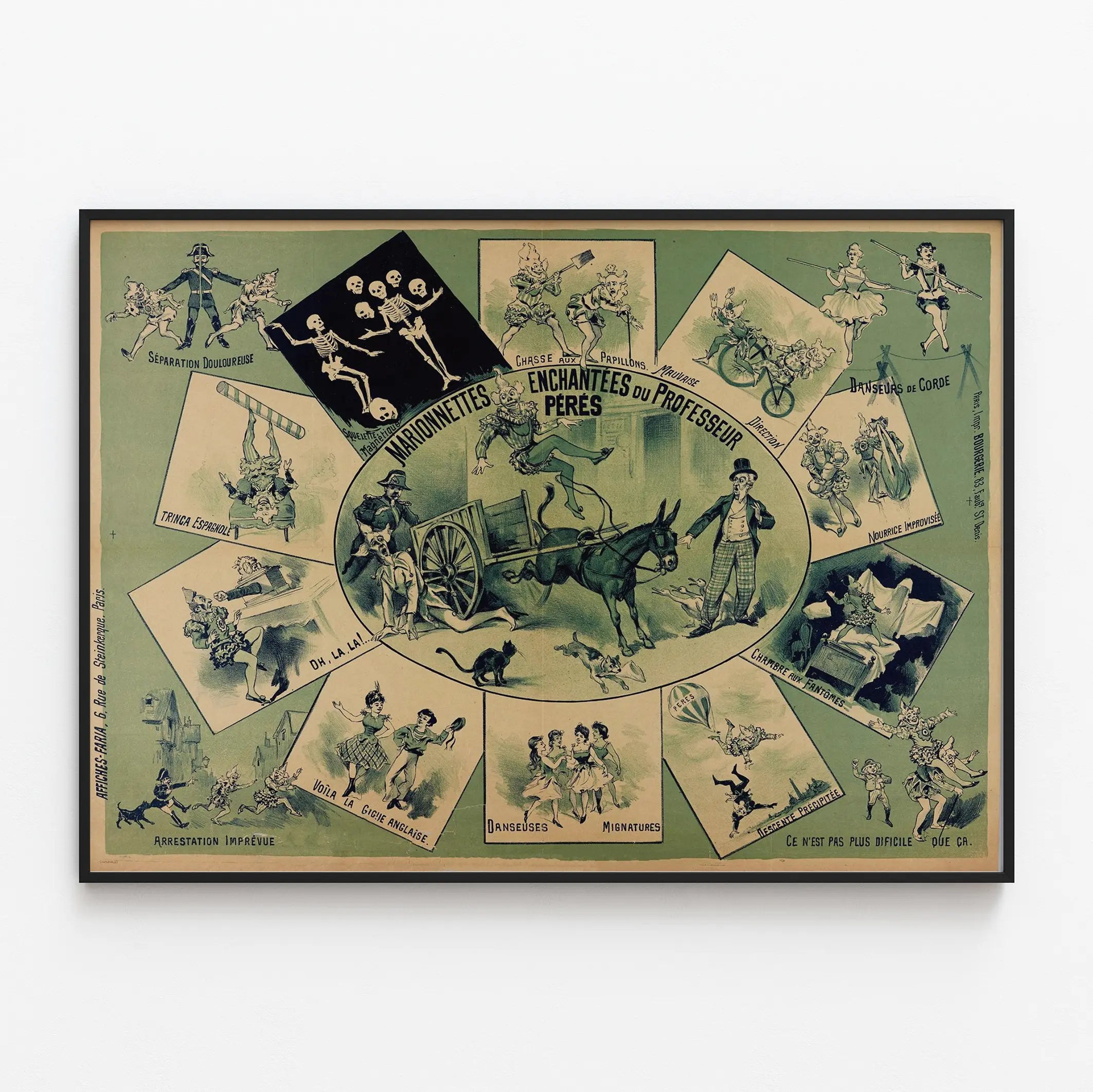 Cette affiche vintage intitulée « Marionnettes Enchantées du Professeur Péres » est une pièce de décoration murale originale qui séduira les amateurs de théâtre de marionnettes et d'illustrations anciennes. Elle présente une composition centrale entourée de scènes illustrées faisant vivre diverses saynètes de marionnettes animées avec humour et fantaisie. Les dessins montrent des personnages costumés dans différents tableaux où se mêlent fantaisie, humour et scènes costumées : squelettes dansants, danseurs de corde, chasse aux papillons, et scènes de « chambre aux fantômes » illustrent un univers théâtral foisonnant.