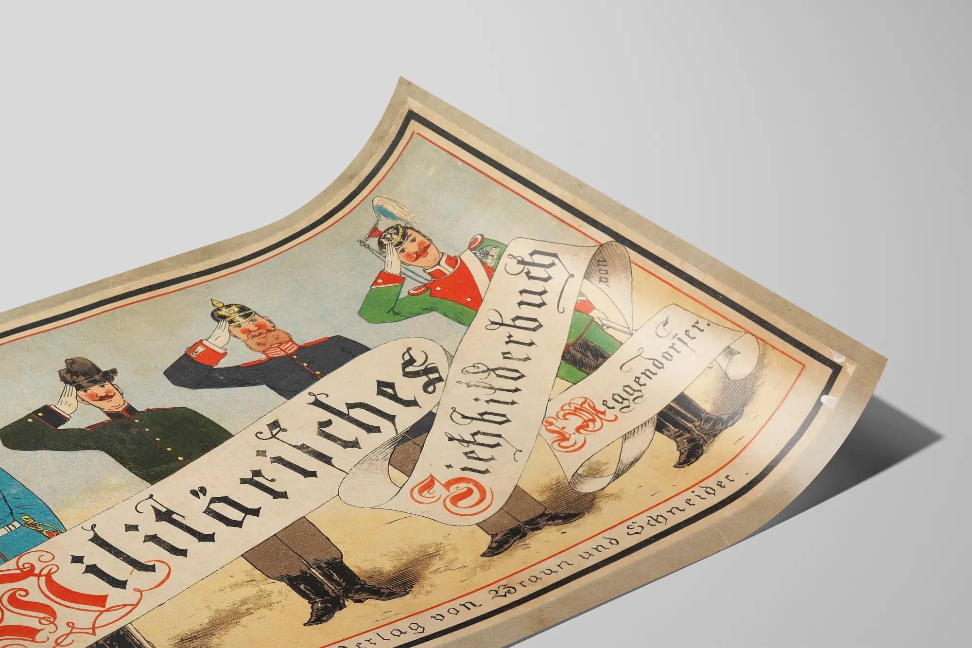 Cette affiche vintage représente une scène militaire stylisée avec quatre soldats en uniforme d'époque se saluant. Chacun porte un uniforme distinctif aux couleurs vives : bleu, vert foncé, bleu marine et vert clair, ornés de détails rouges et blancs. Les soldats sont alignés sur un fond sobre et clair, mettant en valeur leurs tenues aux finitions précises, notamment les boutons dorés, les ceintures blanches et divers couvre-chefs ornementaux, dont un casque à pointe emblématique. Un grand ruban blanc s'enroule horizontalement à travers l'image, portant une inscription en lettres gothiques rouges et noires, ajoutant une touche décorative à cette décoration murale. Cette affiche s'inscrit dans un style graphique ancien, évoquant une ambiance historique et militaire, parfaite pour une décoration murale thématique dans un intérieur vintage ou industriel. Elle apportera une touche d'authenticité et de caractère à votre espace, que ce soit pour un bureau, un salon ou une bibliothèque. Le style et les détails en font une pièce décorative qui capte l'attention tout en restant élégante. Cette affiche militaire est idéale pour ceux qui apprécient la décoration murale originale mêlant art et histoire, apportant une atmosphère unique et chargée de symboles. En choisissant cette décoration murale, vous optez pour un poster au charme ancien, parfait pour enrichir un mur avec un accent artistique et historique. Cette pièce est un bel exemple de poster vintage militaire, alliant esthétisme et récit visuel, idéale pour les amateurs de décoration murale distinctive et thématique.