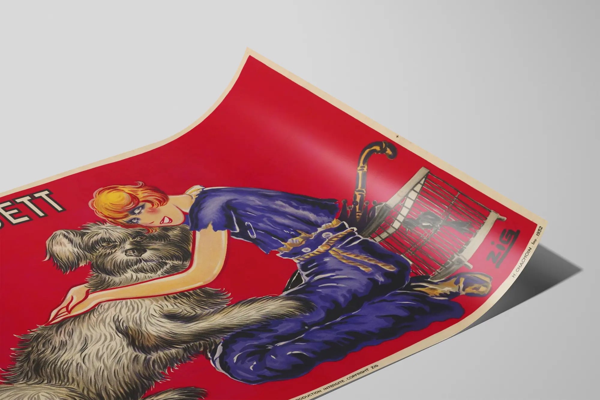 Découvrez cette affiche vintage Mistinguett, une décoration murale unique qui apporte charme rétro et couleur à votre intérieur. Cette affiche originale met en scène une femme élégante, vêtue d'une combinaison bleue, agenouillée et câlinant un grand chien gris aux poils longs. Le fond rouge vif crée un contraste saisissant avec les personnages, accentuant leur présence et dynamisant la pièce. Sur la droite, une cage métallique contenant un oiseau ajoute une touche d'originalité à ce poster au style graphique marqué, signé par l'artiste Zig. Le style artistique ressort avec des traits précis et un mélange subtil de couleurs, incarnant une ambiance des années 1930 authentique et pleine de caractère. Parfait pour une décoration murale de salon, bureau ou chambre, ce tableau imprimé ravira les amateurs d'art graphique vintage et d'éléments décoratifs pleins de vie. Apportez une touche d'élégance et de nostalgie à vos murs avec cette affiche Mistinguett qui capture une scène tendre et pleine de douceur entre une femme et son chien. Ce poster se démarque par ses couleurs intenses et son esthétique rétro, idéale pour les passionnés de décoration murale originale et stylée.