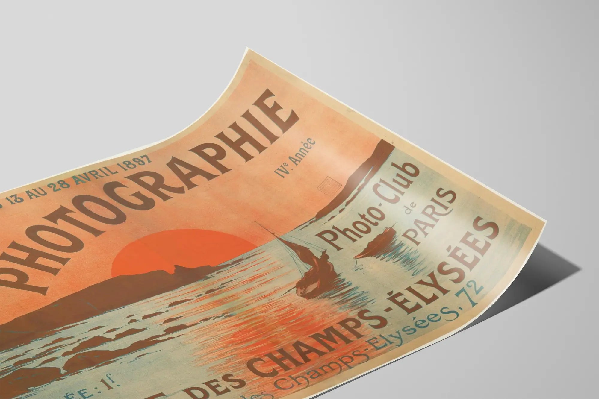 Entdecken Sie dieses außergewöhnliche Vintage-Poster, das die Ausstellung für Fotografie des vierten Jahres ankündigt, die vom 13. bis 28. April 1897 in der Galerie der Champs-Élysées, 72 Avenue der Champs-Élysées in Paris, stattfand. Dieses einzigartige Wandbild zeigt mit Eleganz und Charme eine Meereslandschaft bei Sonnenuntergang, geprägt von zarten orangenen und blauen Tönen, die eine beruhigende Atmosphäre in Ihr Zuhause bringen. Dieses künstlerische Plakat ist perfekt, um Ihrem Wohnzimmer, Büro oder Raum für Fotografie und visuelle Kunst einen retro- und kulturvollen Akzent zu verleihen. Im Posterformat erinnert dieses Wanddekorationstück an die Geschichte der Fotografie in Paris und feiert die Veranstaltung des Photo-Clubs von Paris. Sein vintage-grafischer Stil passt perfekt in eine Einrichtung, die Authentizität und Ästhetik verbindet. Gönnen Sie sich eine originelle und charaktervolle Wanddekoration mit diesem Plakat, das den Geist der künstlerischen Salons des späten 19. Jahrhunderts einfängt. Ein lebendiges Bild für Kunstliebhaber, Fotografen und Geschichtsinteressierte, das Ihren Raum mit einer typisch pariserischen und künstlerischen Atmosphäre bereichert.