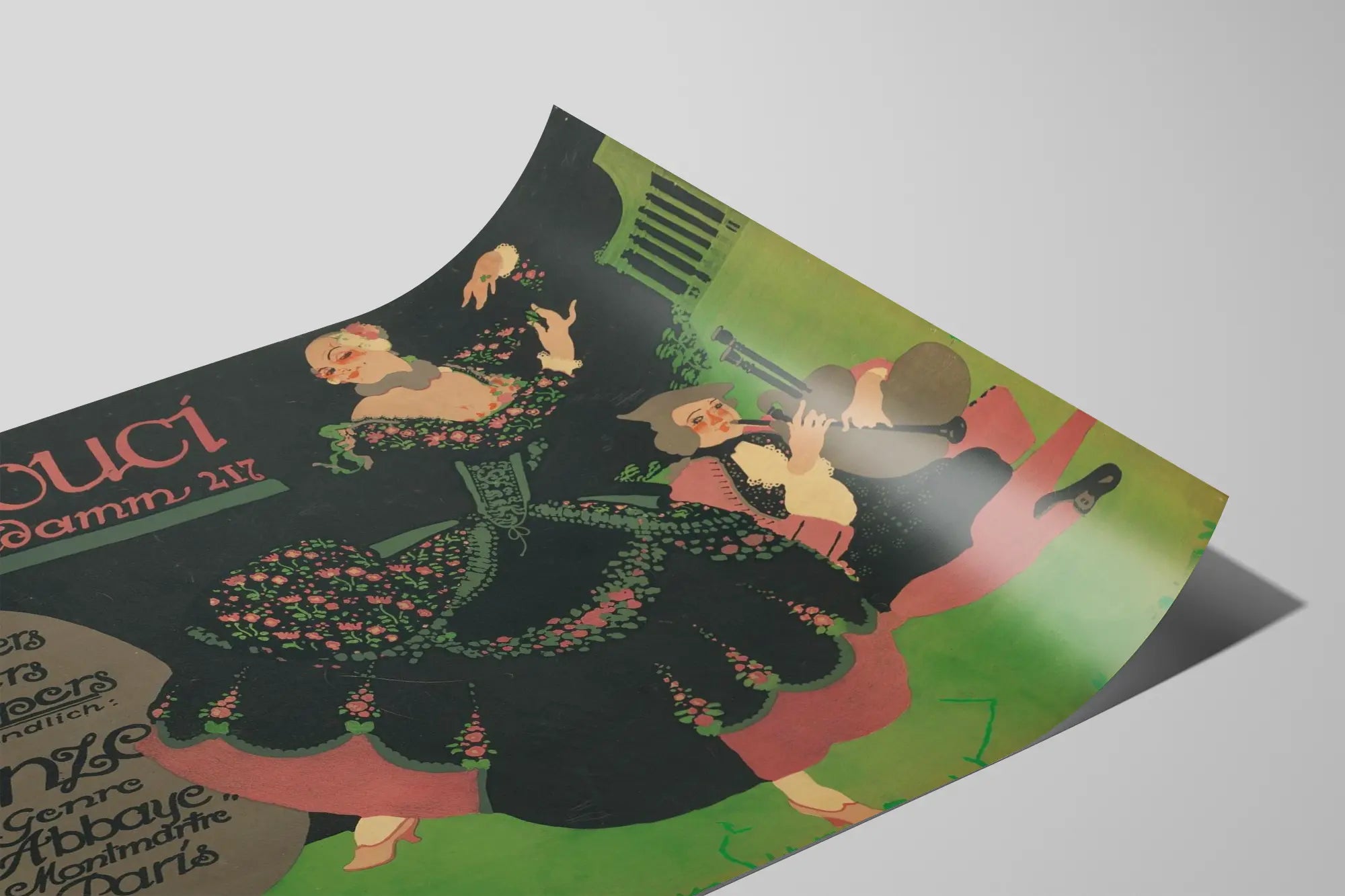 Bringen Sie einen Hauch von Eleganz und nostalgischem Charme in Ihre Wanddekoration mit diesem Vintage-Poster Sanssouci, das die Ankündigung eines Ortes für Mittagessen, Abendessen und Festessen zeigt. Dieses grafisch im alten Stil gestaltete Plakat präsentiert eine lebendige Szene, in der eine Tänzerin in einem prachtvollen Blumenkleid anmutig tanzt, begleitet von einem Musiker, der ein Blasinstrument spielt. Die vorherrschenden Farbtöne sind ein tiefes Grün, ein kontrastreiches Schwarz und rosafarbene Akzente, die die Üppigkeit der Kostüme unterstreichen.