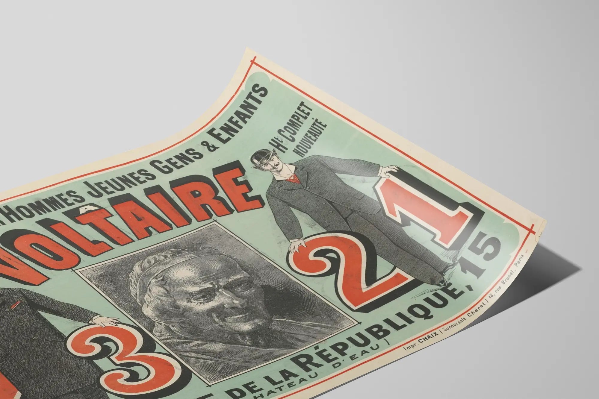 Vintage-Poster Werbung Kleidung Voltaire für Männer und Kinder