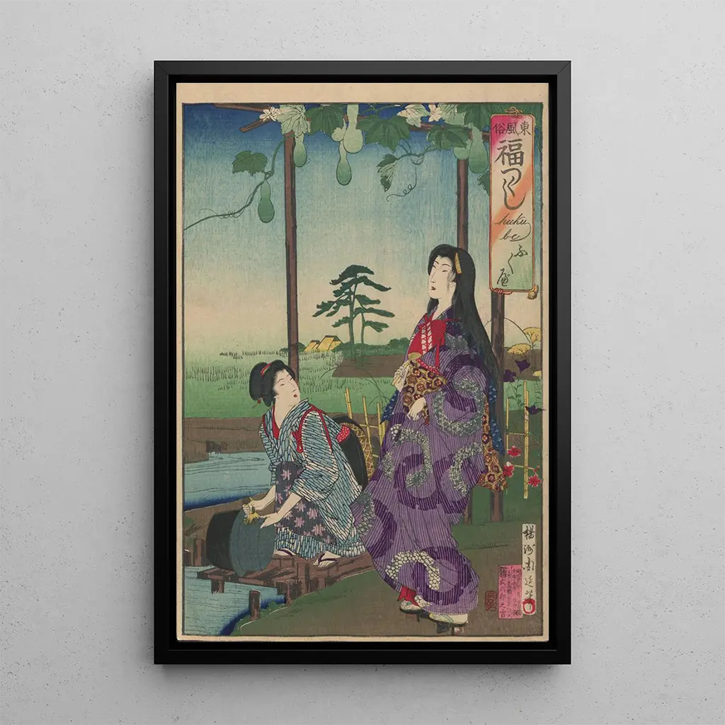 „L'Album de Nishikie Pl19“ von Toyohara Chikanobu ist ein Werk, das die flüchtige Schönheit des traditionellen japanischen Lebens widerspiegelt. Dieser kunstdruck zeichnet sich durch leuchtende Farben und zarte Muster aus, die typisch für Ukiyo-e-Prints sind. Chikanobu beherrscht die Kunst, Szenen des Alltagslebens einzufangen, in denen die Figuren, oft umgeben von bezaubernden Landschaften, in einer Atmosphäre der Gelassenheit zu erblühen scheinen. Jedes Detail, von den verzierten Kleidern bis zu den blumigen Hintergründen, trägt dazu bei, eine poetische und nostalgische Stimmung zu schaffen, die den Betrachter einlädt, in eine Welt vergänglicher Schönheit einzutauchen.