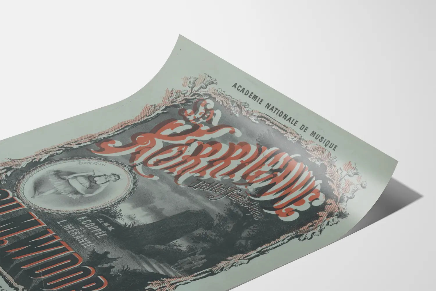Entdecken Sie dieses alte und authentische Plakat, das "La Korrigane" darstellt, ein fantastisches Ballett, präsentiert von der Nationalen Musikakademie. Diese einzigartige Wanddekoration erinnert an die Ästhetik und Atmosphäre klassischer Musik- und Ballettaufführungen und ist perfekt für eine originelle Inneneinrichtung mit musikalischem oder Retro-Thema. Das Plakat hebt den renommierten Namen des Komponisten Ch. M. Widor sowie die Mitwirkenden dieses Werks, F. Coppée und L. Mérante, hervor, was seinen historischen und kulturellen Charakter unterstreicht. Die Zeichnung zeigt einen Rahmen mit ornamentalen pflanzlichen Mustern in Schwarzweiß, mit einer zentralen Illustration, die eine mysteriöse und märchenhafte Atmosphäre evoziert, typisch für die fantastische Welt der Korrigans, legendäre bretonische Wesen. Ein ovales Porträt einer Tänzerin im Ballettkostüm vervollständigt die Darstellung und verleiht diesem Plakat eine poetische und anmutige Note. Dieses Vintage-Poster ist eine ideale Wahl für Musikliebhaber, Ballettfans und Innenarchitektur-Enthusiasten, die ihrem Wohnraum einen Hauch von Eleganz und Nostalgie verleihen möchten. Leicht einzurahmen und zu installieren, eignet es sich sowohl für ein Wohnzimmer, eine Bibliothek als auch für ein Büro und spiegelt den Reichtum des künstlerischen Erbes und der Bühnenkünste wider. Dieses Stück ist auch eine schöne Hommage an die Aufführungen vergangener Zeiten und die französischen Musiktraditionen, während es gleichzeitig ein dekoratives Element mit reicher Geschichte bietet.