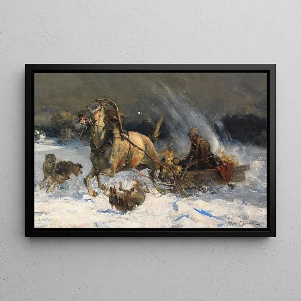 Angriff der Wölfe: ein wildes und fesselndes Drama Das Werk "Angriff der Wölfe" von Alfred von Wierusz-Kowalski taucht den Betrachter in eine Szene dramatischer Spannung ein, in der die wilde Natur mit Kraft entfaltet wird. Die Komposition, die auf die in Bewegung befindlichen Wölfe fokussiert, wird durch dunkle Farben und Grautöne verstärkt, die die Kälte des Winters hervorrufen. Die Technik des Künstlers, die Realismus und Romantik verbindet, ermöglicht es, die Intensität des Moments zu spüren. Die detaillierten Darstellungen der Tiere und der umgebenden Landschaft schaffen eine immersive Atmosphäre, in der jedes Element zur Erzählung dieser wilden Jagd beiträgt. Dieses Gemälde ist eine wahre Hommage an die Schönheit und Grausamkeit der Natur. Alfred von Wierusz-Kowalski: ein Meister der Tiermalerei Alfred von Wierusz-Kowalski, geboren 1849, ist bekannt für seine beeindruckenden Darstellungen wilder Tiere, insbesondere im Kontext der polnischen Landschaften. Beeinflusst von Romantik und Realismus, konnte er die Majestät und Brutalität der Fauna einfangen. Seine Karriere, geprägt von Ausstellungen in Paris und München, hat ihm einen Namen in der Kunstwelt eingebracht. "Angriff der Wölfe" ist eines seiner emblematischsten Werke und zeigt sein Talent, Jagdszenen mit dramatischer Intensität darzustellen. Sein Werk zeugt von einer Epoche, in der die wilde Natur sowohl Inspirationsquelle als auch Quelle der Furcht war. Eine dekorative Anschaffung mit vielfältigen Vorzügen Die Reproduktion von "Angriff der Wölfe" ist ein dekoratives Stück, das Ihrem Interieur einen Hauch von Kühnheit verleiht, sei es im Wohnzimmer, im Büro oder im Schlafzimmer. Die Qualität der Kunstdruck-Reproduktion garantiert eine beeindruckende Treue zu den Details und Farben des Originalwerks und bietet eine faszinierende ästhetische Anziehungskraft. Dieses Gemälde, mit seiner wilden und dramatischen Atmosphäre, lädt zur Reflexion und Flucht ein. Durch die Integration dieses Bildes in Ihre Dekoration fügen Sie eine starke künstlerische Dimension hinzu und feiern gleichzeitig die Schönheit und Kraft der wilden Natur, wie Wierusz-Kowalski sie wahrgenommen hat.