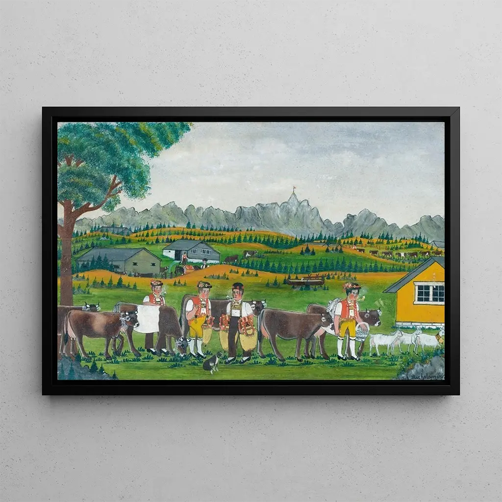Ankunft auf der Alm: eine Ode an die alpine Natur „Ankunft auf der Alm“, ein Werk von Johannes Rechsteiner, ruft die majestätische Schönheit der Alpenlandschaften hervor. Dieses Bild fängt einen Moment der Gelassenheit ein, in dem die Figuren, umgeben von imposanten Bergen, im Einklang mit der Natur zu stehen scheinen. Die sanften Töne von Grün und Blau, kombiniert mit goldenen Lichtakzenten, schaffen eine ruhige und kontemplative Atmosphäre. Die Technik von Rechsteiner, geprägt von einer sorgfältigen Detailarbeit, ermöglicht es, die Frische der alpinen Luft und die Ruhe des Umfelds zu spüren und lädt den Betrachter ein, in diese idyllische Umgebung einzutauchen. Johannes Rechsteiner: ein Maler der Schweizer Landschaften Johannes Rechsteiner, ein Schweizer Künstler des 19. Jahrhunderts, ist bekannt für seine alpinen Landschaften, die seine Liebe zur Natur widerspiegeln. Beeinflusst vom Romantizismus, konnte er die Majestät der Schweizer Berge mit einer einzigartigen Sensibilität einfangen. Seine Karriere, obwohl weniger bekannt als die einiger seiner Zeitgenossen, war geprägt von dem Wunsch, die natürliche Schönheit seines Landes darzustellen. Rechsteiner trug dazu bei, eine nationale Identität durch die Kunst zu entwickeln, wobei er die Schweizer Landschaften als Symbol von Stolz und Ästhetik hervorhob. Eine dekorative Anschaffung mit vielfältigen Vorzügen Der kunstdruck von „Ankunft auf der Alm“ ist eine perfekte dekorative Wahl für alle, die ihrem Zuhause einen Hauch Natur verleihen möchten. Ob im Wohnzimmer, im Büro oder im Schlafzimmer, dieses Leinwandbild bietet eine außergewöhnliche Druckqualität und eine Treue zum Originalwerk, die alle Kunstliebhaber begeistern wird. Seine ästhetische Anziehungskraft, verbunden mit der Ruhe, die es ausstrahlt, verwandelt jeden Raum in eine Oase der Entspannung. Durch die Integration dieses Werks in Ihre Dekoration bringen Sie die Schönheit der Schweizer Alpen in Ihr Zuhause und schaffen so eine beruhigende und inspirierende Atmosphäre.