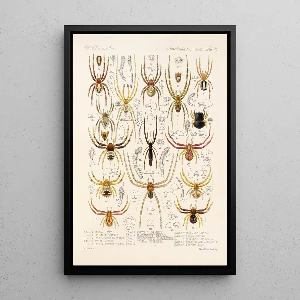 Arachnida Araneidea Pl 15 : eine Hommage an die arachnidische Vielfalt „Arachnida Araneidea Pl 15“ von Frederick DuCane Godman ist eine illustration, die die Vielfalt der Spinnen feiert. Mit akribischer Liebe zum Detail hebt diese kunstdruck die einzigartigen Merkmale jeder dargestellten Art hervor. Die lebendigen Farben und zarten Texturen schaffen eine lebendige, fast greifbare Atmosphäre, die zur Beobachtung einlädt. Godman gelingt es durch seine naturalistische Illustrationstechnik, das Wesen dieser Kreaturen einzufangen und ein einfaches Bild in eine visuelle Erkundung ihrer Welt zu verwandeln. Frederick DuCane Godman : ein Künstler im Dienste der Wissenschaft Frederick DuCane Godman, Illustrator und Naturforscher des 19. Jahrhunderts, prägte seine Zeit durch Werke, die Kunst und Wissenschaft verbinden. Seine Leidenschaft für die Entomologie führte ihn dazu, präzise und ästhetische illustration zu erstellen, was ihn zu einem Pionier auf diesem Gebiet machte. „Arachnida Araneidea Pl 15“ ist Teil einer Reihe von Werken, die darauf abzielen, die Öffentlichkeit über die Vielfalt der Biodiversität aufzuklären. Sein künstlerischer Ansatz, beeinflusst von den wissenschaftlichen Fortschritten seiner Zeit, machte es möglich, die Schönheit der natürlichen Welt einem breiten Publikum zugänglich zu machen. Eine dekorative kunstdruck-aufnahme mit vielfältigen Vorteilen Der kunstdruck des Gemäldes „Arachnida Araneidea Pl 15“ ist eine dekorative Wahl, die Kunst- und Naturliebhaber begeistern wird. Ob in einem Arbeitsbereich, Wohnzimmer oder Schlafzimmer, diese Leinwand bringt eine Prise Originalität und Eleganz. Die Druckqualität garantiert eine bemerkenswerte Treue zu den Details, sodass die Schönheit der Spinnen voll zur Geltung kommt. Durch die Integration dieses Werks in Ihre Dekoration schaffen Sie eine inspirierende Umgebung und regen gleichzeitig spannende Gespräche über die Vielfalt der arachnidischen Fauna an.