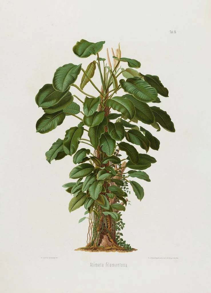 Das Werk "Aroideae Maximilianae Pl19" von Heinrich Wilhelm Schott ist eine faszinierende Darstellung der tropischen Flora. Mit seinen lebendigen Farben und seinen detaillierten Feinheiten vermittelt dieses Kunstwerk eine Atmosphäre von Üppigkeit und Staunen. Die Lithographietechnik ermöglicht es, die Textur der Blätter und die Zartheit der Blumen einzufangen, und bietet eine Eintauchen in eine reiche und vielfältige botanische Welt. Jedes Element ist sorgfältig angeordnet und schafft eine harmonische Komposition, die zur Erkundung und Betrachtung der Wunder der Natur einlädt.