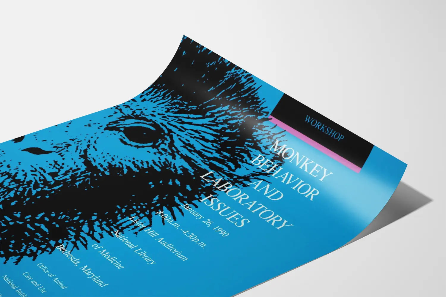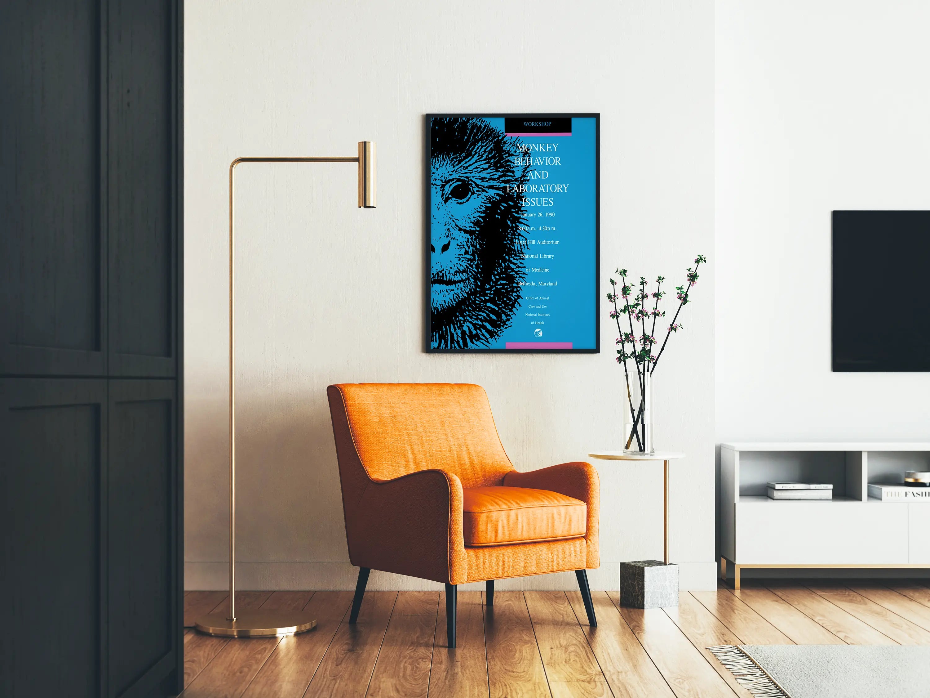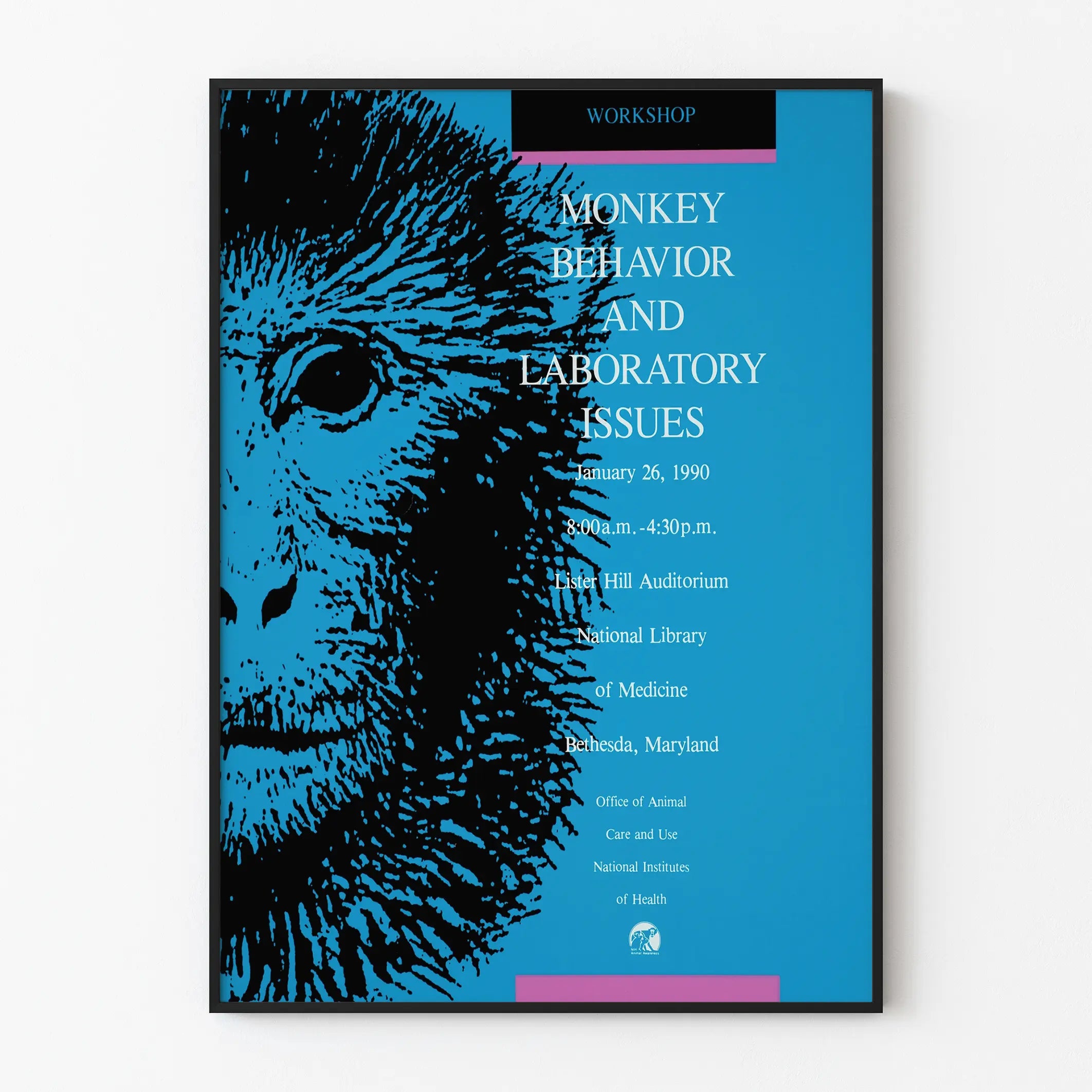 Dieses Wanddekorationsposter zeigt ein künstlerisches Profil eines Affen in Schwarz auf einem leuchtend blauen Hintergrund und verleiht Ihrem Raum sowohl eine wissenschaftliche als auch ästhetische Note. Es bezieht sich auf ein Workshop mit dem Titel „Verhalten von Affen und Laborfragen“, der anscheinend das Verhalten von Affen im Laborumfeld behandelt. Der klare, weiße Text ist gut lesbar und verleiht dem Design einen schlichten, professionellen Stil – ideal für eine Wanddekoration für Wissenschafts-, Biologie- oder Primatologieliebhaber.