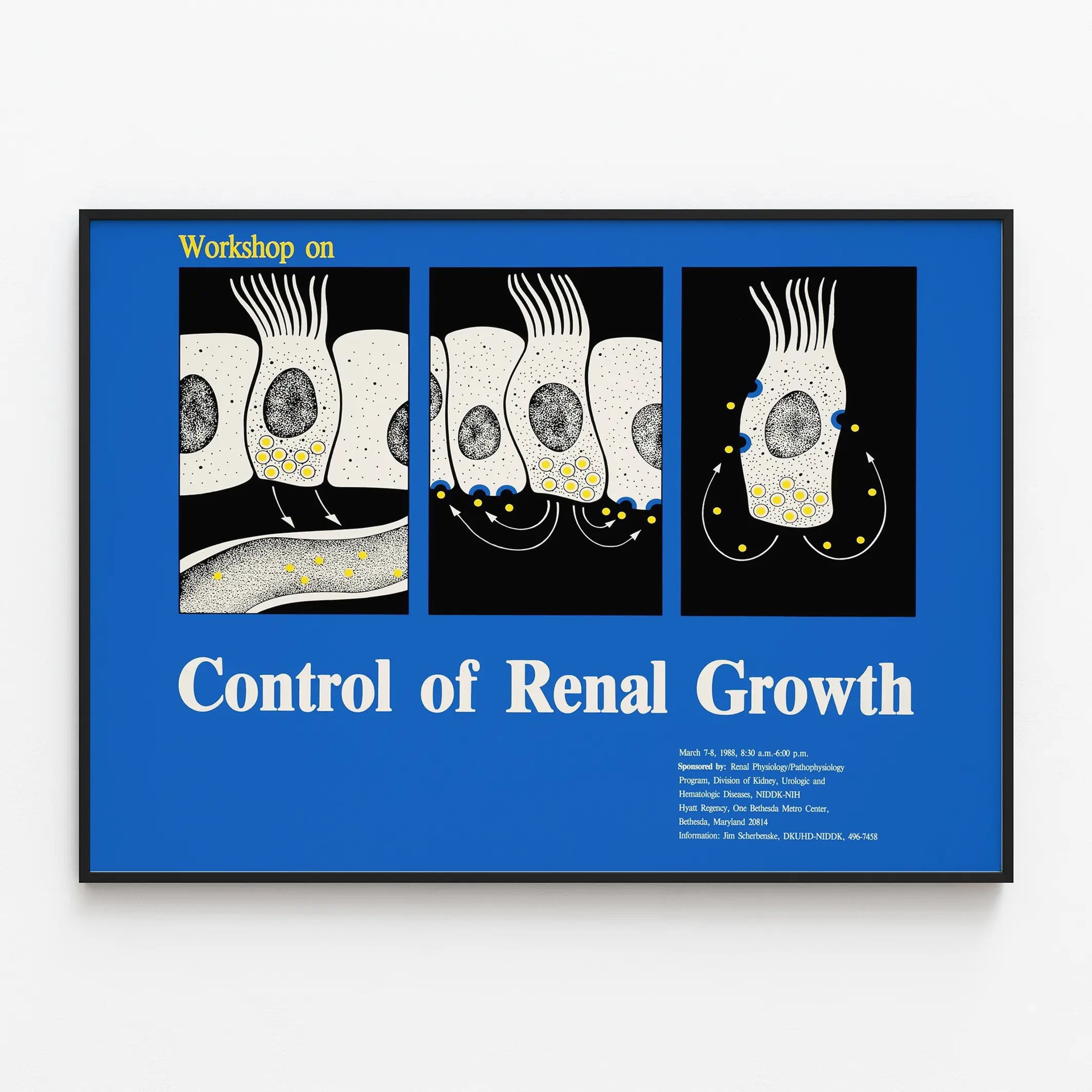 Dieses Vintage-Poster zeigt eine wissenschaftliche Werkstatt zur Kontrolle des Nierenwachstums, mit einem Design, das von biologischen Diagrammen inspiriert ist. Die Wanddekoration bietet drei grafische Paneele, die Zellen im klaren, punktierten Stil darstellen und eine ästhetische Balance zwischen pädagogischer und künstlerischer Gestaltung schaffen. Das Poster spielt mit einem intensiven blauen Hintergrund, der die Illustrationen in Schwarz, Weiß und Gelb hervorhebt und einen Hauch von Modernität verleiht, während es gleichzeitig an die medizinische und wissenschaftliche Welt erinnert. Dieses Plakat ist ideal für eine originelle Wanddekoration, insbesondere in Räumen, die der Wissenschaft, Medizin oder Bildung gewidmet sind. Das Gleichgewicht zwischen dem sichtbaren Text, geschrieben in klassischer weißer Typografie, und den linearen Bildern unterstreicht den informativen und dekorativen Charakter dieses Stücks. Das zentrale Motiv erinnert an die Zellregulation auf Nierenebene, was das Interesse an biologischen Wissenschaften und medizinischer Forschung fördern kann. Ob im Büro, im Studienraum oder in einer Bibliothek – dieses Poster bringt eine Note von intellektueller Eleganz und zeitgenössischem Stil. Mit seinem sorgfältigen Grafikdesign passt dieses Plakat perfekt zu moderner und unkonventioneller Wanddekoration und bietet eine künstlerische Sicht auf ein komplexes wissenschaftliches Thema.