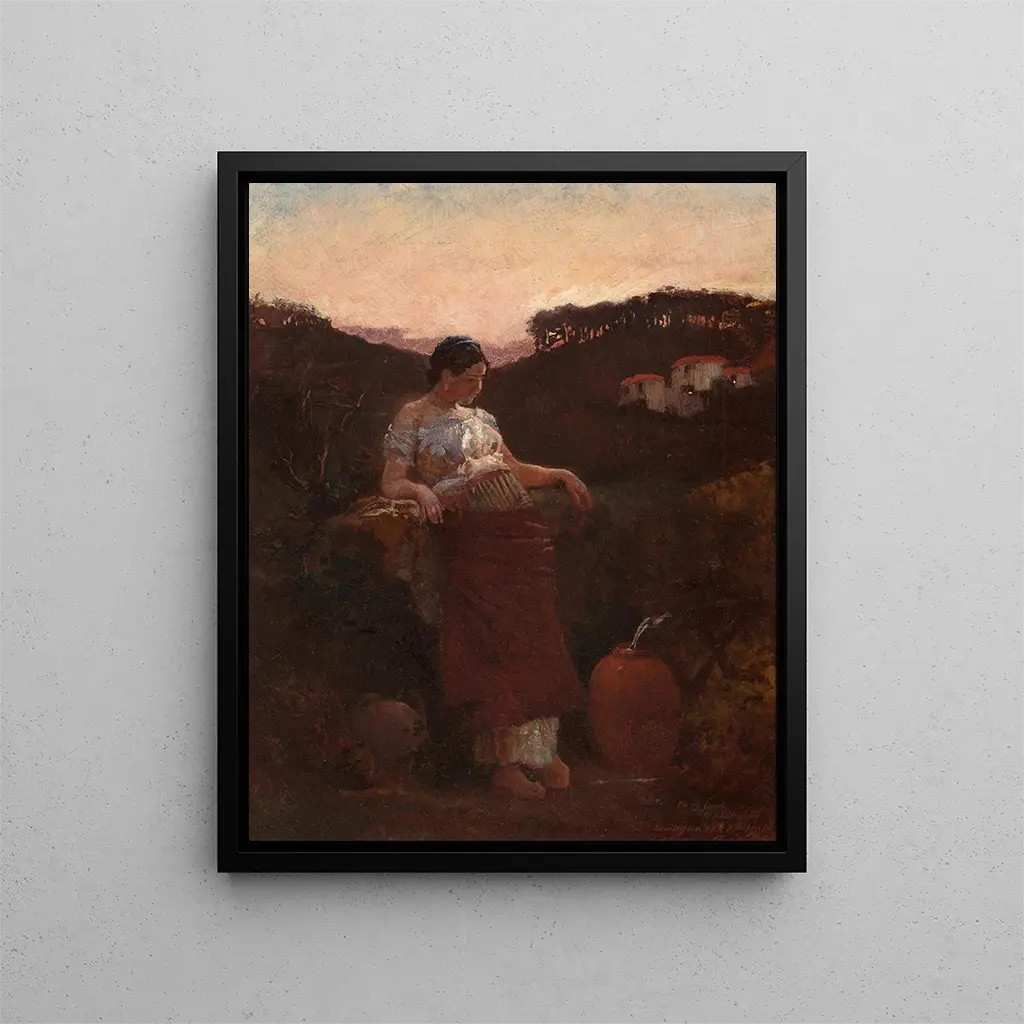 Reproduktion Am Brunnen - Edwin Howland Blashfield – Fesselnde Einführung Im weiten Panorama der Kunstgeschichte heben sich bestimmte Werke durch ihre Fähigkeit hervor, einen Moment, eine Emotion oder eine Atmosphäre einzufangen. "Am Brunnen" von Edwin Howland Blashfield ist eines dieser Werke, das den Betrachter in eine Welt voller Gelassenheit und Kontemplation entführt. Dieses Gemälde evoziert nicht nur einen Moment des Alltagslebens, sondern verkörpert auch eine Ästhetik, die die Zeit überdauert. Durch die Darstellung einer Frau am Brunnen lädt Blashfield uns ein, über die Einfachheit der täglichen Gesten und ihre innere Schönheit nachzudenken. Stil und Einzigartigkeit des Werks Der Stil von Blashfield zeichnet sich durch eine sorgfältige Detailgenauigkeit und eine subtile Nutzung des Lichts aus. In "Am Brunnen" schaffen sanfte Farben und zarte Nuancen eine beruhigende, fast traumhafte Atmosphäre. Die Komposition ist sorgfältig ausbalanciert, hebt die weibliche Figur hervor und integriert harmonisch die umgebenden Elemente. Das Wasser des Brunnens, Symbol für Leben und Erneuerung, spielt eine zentrale Rolle in diesem Werk, während die umliegende Landschaft eine großzügige und einladende Natur beschreibt. Dieses Gemälde beschränkt sich nicht nur auf eine einfache Darstellung; es erzählt eine Geschichte, die einer Frau in Interaktion mit ihrer Umgebung, und unterstreicht so die Harmonie zwischen Mensch und Natur. Der Künstler und sein Einfluss Edwin Howland Blashfield, geboren 1848, ist ein Künstler, dessen Werk tief vom Präraffaeliten-Bewegung und dem amerikanischen Realismus beeinflusst wurde. Seine Karriere, geprägt von einer unermüdlichen Suche nach Schönheit und Wahrheit, zeugt von dem Wunsch, den Alltag auf ein Niveau poetischer Bildsprache zu heben. Blashfield hat sich als Meister der Fresken durchgesetzt, doch in seinen Gemälden erkennt man seine Fähigkeit, Momente der Anmut einzufangen. Sein Einfluss reicht über seine eigenen Werke hinaus und inspiriert zahlreiche zeitgenössische Künstler, die Beziehung zwischen Mensch und Umwelt zu erforschen. "Am Brunnen" ist eine perfekte Illustration dieser Suche, bei der jeder Pinselstrich mit einem tiefen Verständnis der menschlichen Bedingung zu resonieren scheint. Eine außergewöhnliche Wanddekoration signiert von Artem Legrand Im Rahmen einer Inneneinrichtung, das Werk