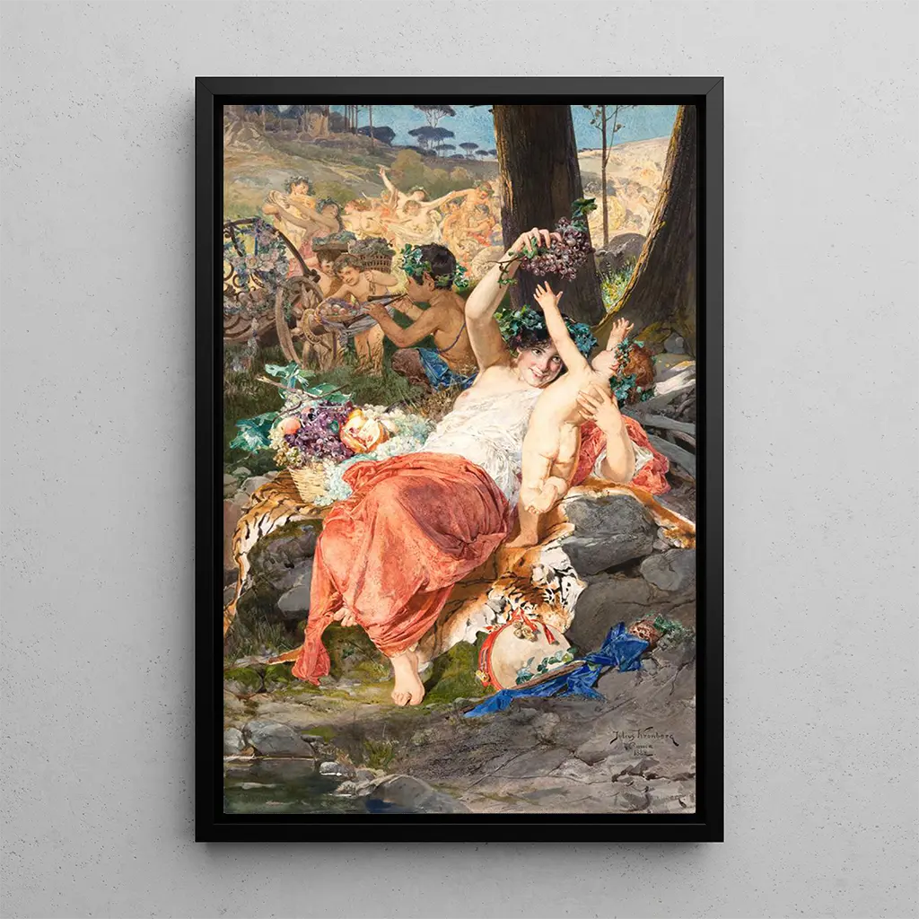 In diesem lebendigen Werk taucht Julius Kronberg in das Herz einer Szene voller Sinnlichkeit und Bewegung ein. Die Bacchante, mythologische Figur, wird in einem ausgelassenen Tanz dargestellt, umgeben von üppigem Laub und leuchtenden Früchten. Die warmen Farben und das Spiel mit Licht verstärken die Energie der Komposition, während die Technik des Künstlers, die Realismus und symbolische Elemente verbindet, eine fesselnde Atmosphäre schafft. Jedes Detail, von den fließenden Drapierungen bis zu den fröhlichen Ausdrücken, lädt zu einer tiefen Betrachtung der Schönheit des Lebens und der Natur ein.