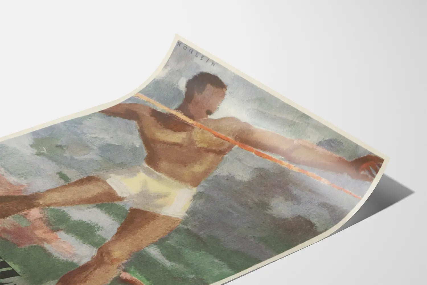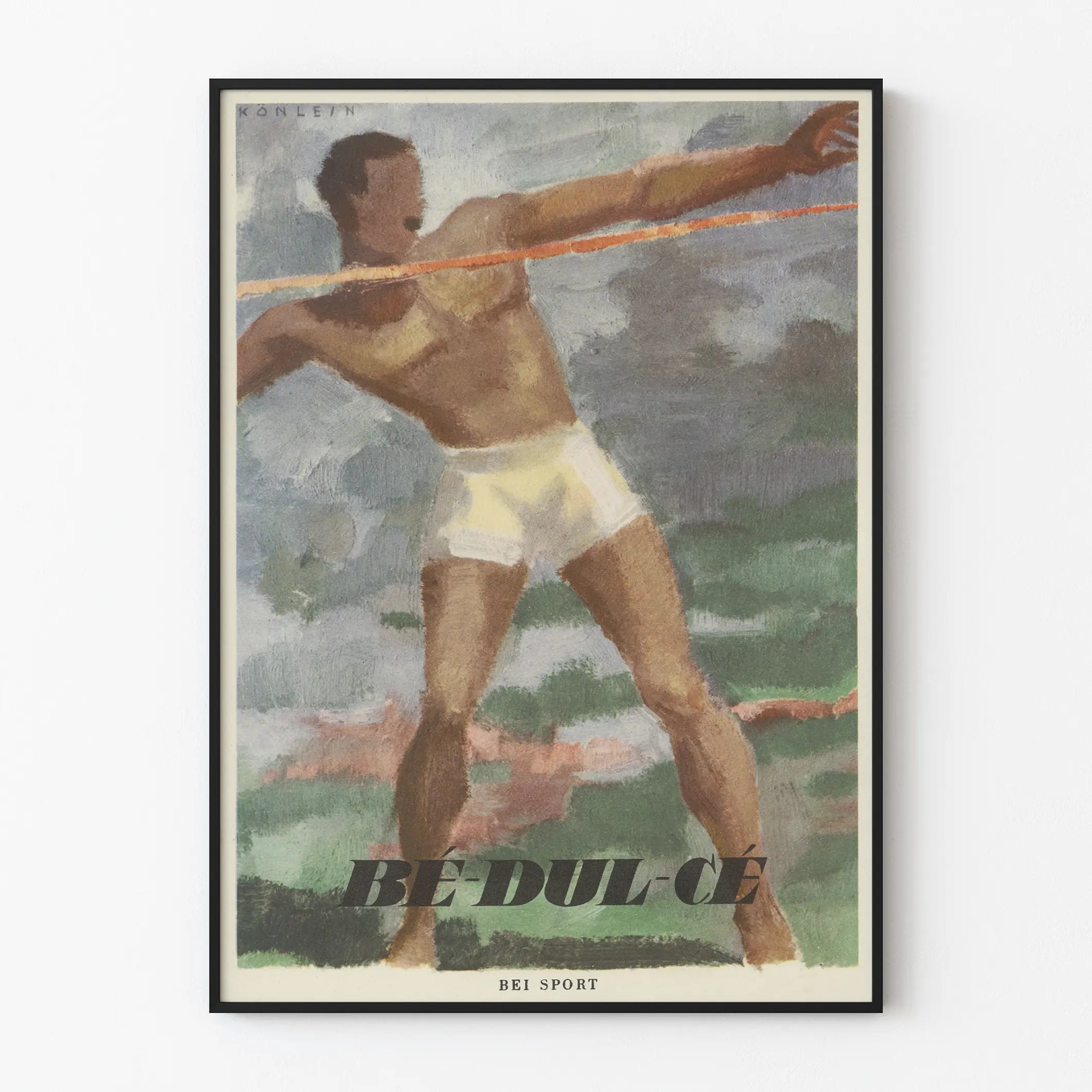 Dieses Bé-Dul-Cé-Poster zeigt einen Athleten in voller Aktion beim Speerwurf, was die Kraft und Beweglichkeit des Sports symbolisiert. Die Figur trägt eine weiße Shorts, die eine dynamische Haltung einnimmt und die Bewegung sowie die Energie der sportlichen Geste einfängt. Das Werk spielt mit sanften, natürlichen Farbtönen, hauptsächlich in Nuancen von Braun, Grün und Grau, was ihm ein einzigartiges Vintage- und Kunst-Feeling verleiht.