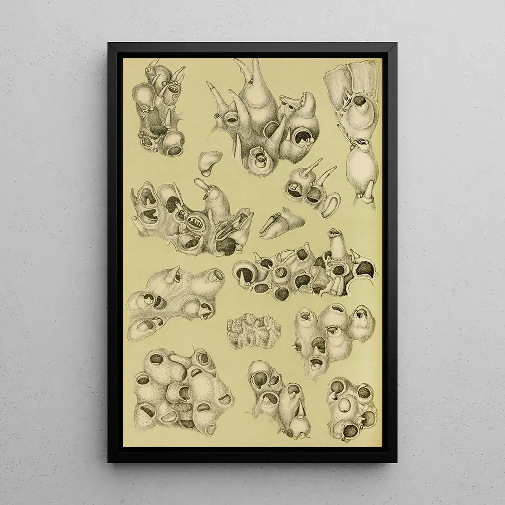 Die reproduktion von Bryozoaires V taucht uns in eine faszinierende Welt ein, in der die Zartheit der organischen Formen mit einer Palette sanfter und beruhigender Farben verschmilzt. Frederick McCoy fängt mit bemerkenswerter Präzision die Schönheit der bryozoaires ein, dieser oft unbekannten Meereskreaturen. Die detaillierten Feinheiten und die Textur der dargestellten Elemente schaffen eine fast traumhafte Atmosphäre, die den Betrachter einlädt, sich über die Komplexität des Meereslebens zu wundern. Jeder Farbton, von zarten Grüntönen bis zu warmen Brauntönen, ruft die Reichtümer der Meeresböden hervor und verwandelt dieses Werk in eine wahre Ode an die Natur.