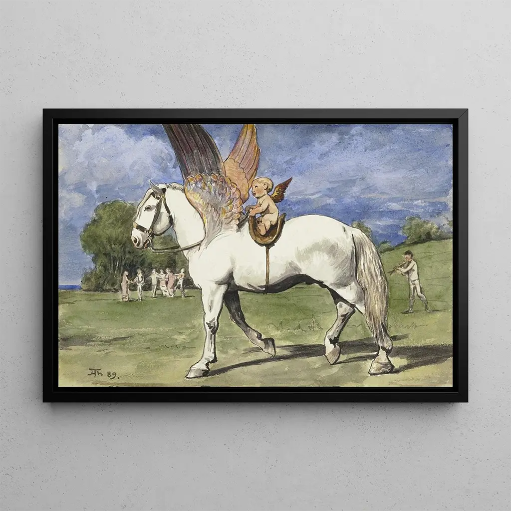 Chérubin auf Pegasus: ein Flug in die Fantasie Die kunstdruck Chérubin auf Pegasus, geschaffen von Hans Thoma, erinnert an eine märchenhafte Welt, in der Himmel und Erde aufeinandertreffen. Dieses fesselnde Werk zeigt einen Chérubin, Symbol für Unschuld und Reinheit, der auf einem majestätischen Pegasus reitet. Die zarten, leuchtenden Pastellfarben schaffen eine traumhafte Atmosphäre, während die detaillierten Federn und Wolken eine träumerische Dimension hinzufügen. Thoma gelingt es, das Wesen des Flugs einzufangen und den Betrachter einzuladen, in ferne und fantastische Länder zu entfliehen. Hans Thoma: ein Künstler zwischen Tradition und Moderne Hans Thoma, eine ikonische Figur der deutschen symbolistischen Bewegung am Ende des 19. Jahrhunderts, verstand es, Tradition und Moderne in seinen Werken zu vereinen. Beeinflusst von den Meistern der romantischen Malerei, entwickelt er einen persönlichen Stil, der Realismus und fantastische Elemente verbindet. Seine Kreationen, oft inspiriert von Mythologie und Märchen, zeugen von einer tiefen Sensibilität und einem Streben nach Harmonie. Thoma hat einen nachhaltigen Einfluss auf die deutsche Kunst hinterlassen, und seine Werke inspirieren weiterhin Kunstliebhaber weltweit. Eine dekorative Anschaffung mit vielfältigen Vorzügen Der kunstdruck Chérubin auf Pegasus ist eine ideale dekorative Ergänzung für jeden Raum in Ihrem Zuhause, sei es Wohnzimmer, Schlafzimmer oder Büro. Seine Druckqualität garantiert eine bemerkenswerte Treue zu den Nuancen und Details des Originalwerks und verleiht Ihrer Inneneinrichtung einen Hauch von Eleganz und Traumhaftigkeit. Mit seinem unbestreitbaren ästhetischen Reiz lädt dieses Bild zur Betrachtung und Flucht ein und verwandelt Ihren Raum in einen Ort der Inspiration und Gelassenheit. Mit der Wahl dieses kunstdrucks schenken Sie Ihrem Interieur ein Kunstwerk, das die Fantasie anregt.