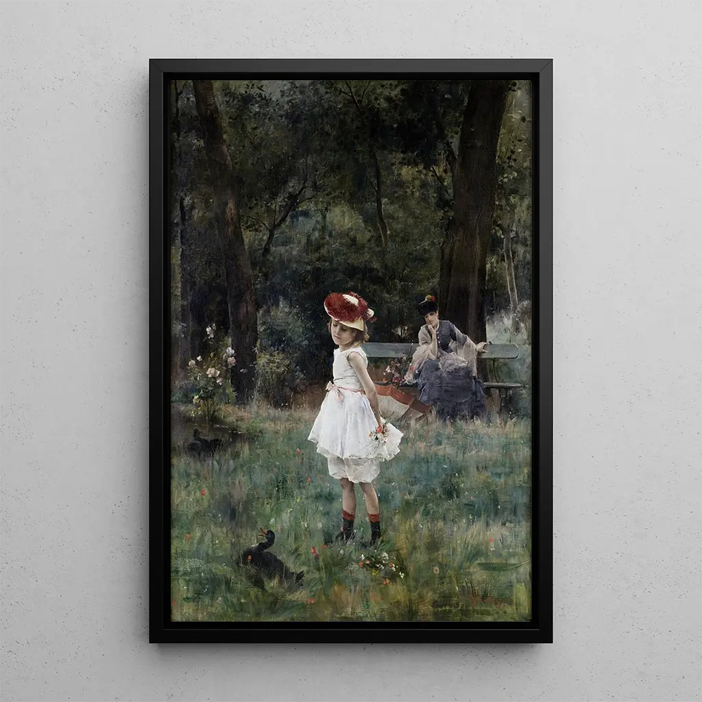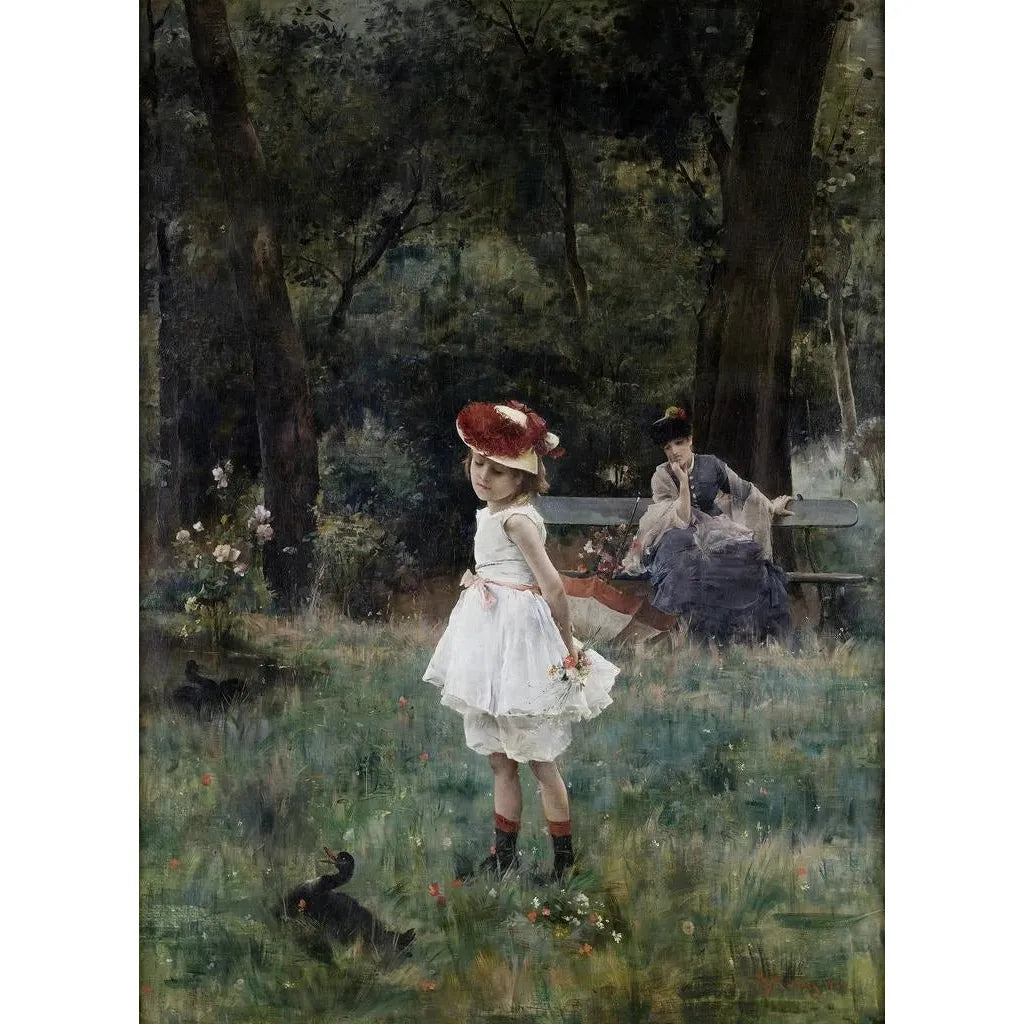 Alfred Stevens, belgischer Maler des 19. Jahrhunderts, ist bekannt für seine Darstellungen des Alltagslebens und intimer Szenen. Beeinflusst vom Realismus, konnte er das Wesen der bürgerlichen Gesellschaft seiner Zeit einfangen. Seine Werke, oft mit weiblichen Figuren im Mittelpunkt, spiegeln eine besondere Sensibilität und eine feine Beobachtung der Sitten wider. Stevens war in Paris aktiv, wo er mit bedeutenden Künstlern seiner Zeit zusammenarbeitete, und sein Stil entwickelte sich zu einem impressionistischen Ansatz, der Elemente von Licht und Farbe integriert, die seine Kompositionen bereichern. La fillette aux canards veranschaulicht perfekt sein Talent, Emotionen durch einfache, aber eindrucksvolle Szenen zu vermitteln.