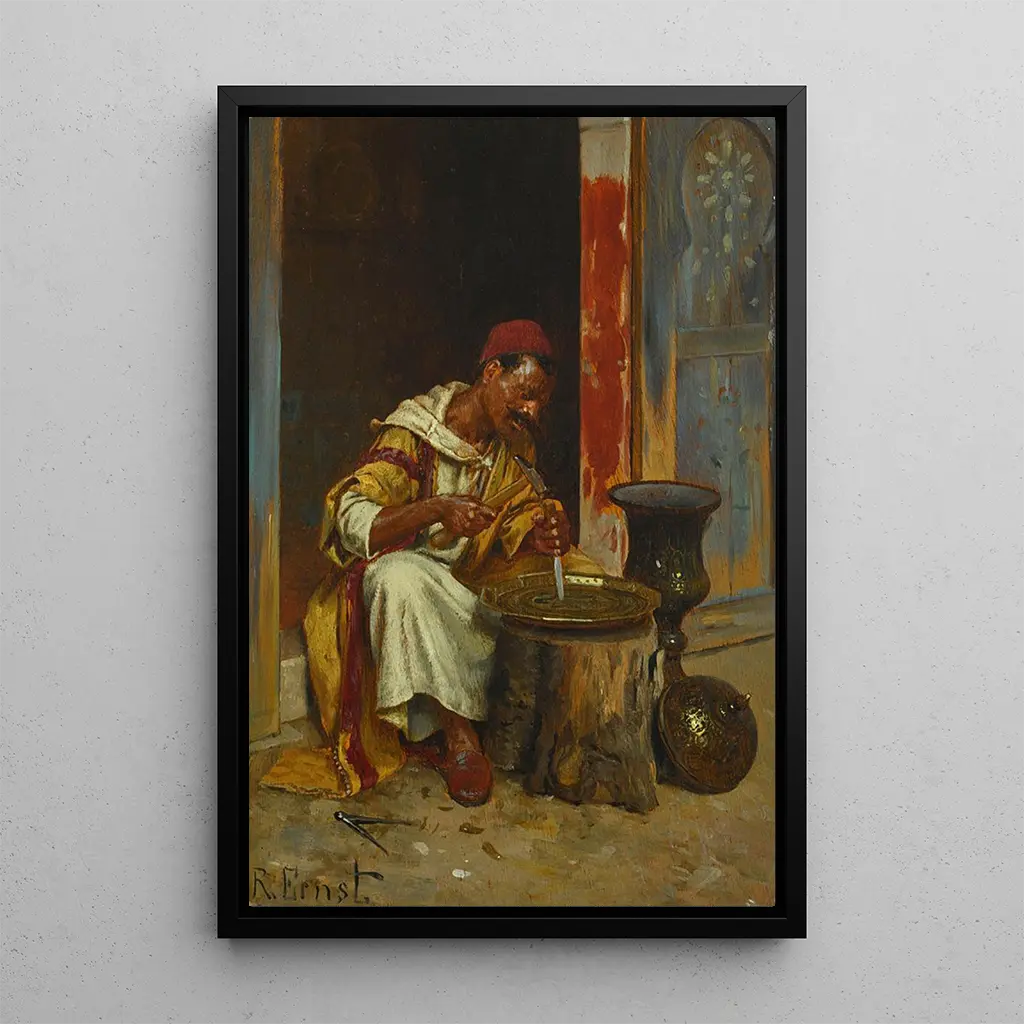 Rudolf Ernst, ein österreichischer Maler, ist bekannt für seine orientalistischen Werke, die die Magie und Exotik orientalischer Kulturen einfangen. Aktiv Ende des 19. Jahrhunderts, lässt er sich von Reisen und Erzählungen des Orients inspirieren und übersetzt diese Erfahrungen in detailreiche und farbenfrohe Gemälde. Seine Ausbildung an der Akademie der bildenden Künste Wien und seine vielfältigen Einflüsse, die vom Realismus bis zum Romantizismus reichen, ermöglichen ihm, einen einzigartigen Stil zu entwickeln. "Le Travailleur du laiton" veranschaulicht perfekt sein Talent, das tägliche Leben und traditionelle Berufe darzustellen, während es gleichzeitig ein Fenster zu einer faszinierenden Welt öffnet, die dem westlichen Publikum oft unbekannt ist.