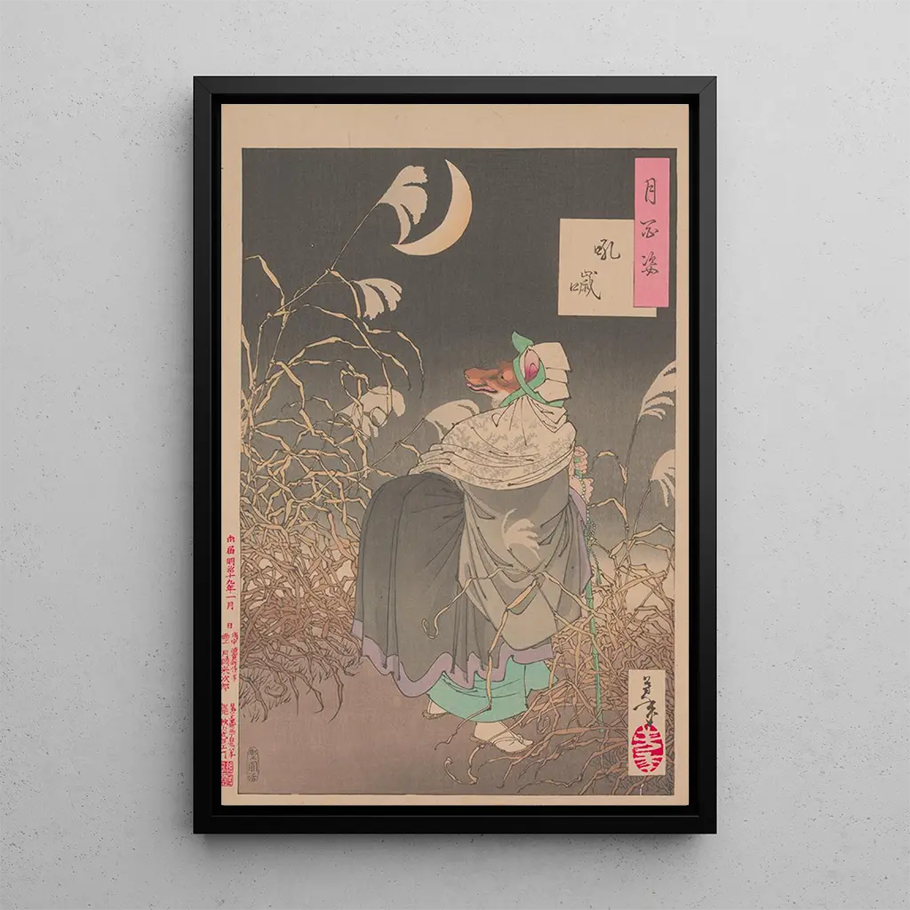 In dieser kunstreproduktion des Gemäldes "Le cri du renard Konkai" taucht uns Tsukioka Yoshitoshi in eine Welt ein, in der Natur und Fantastisches aufeinandertreffen. Die lebendigen Farben und die feinen Linien des Künstlers schaffen eine Atmosphäre, die zugleich verstörend und bezaubernd ist. Der Fuchs, Symbol für Transformation und Geheimnis in der japanischen Kultur, scheint einen Schrei auszustrahlen, der durch die nächtliche Landschaft hallt. Die Ukiyo-e-Drucktechnik, charakteristisch für Yoshitoshi, ermöglicht es, beeindruckende Details, subtile Schatten und Lichtnuancen einzufangen, die diese rätselhafte Szene zum Leben erwecken.