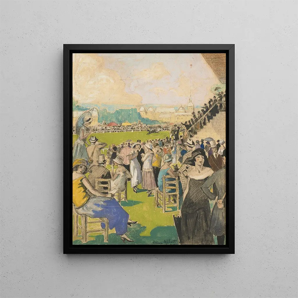 Ablett gelingt es, die Vitalität der Bewegung und die Leichtigkeit des Lebensmoments wiederzugeben, während er eine ausgewogene Komposition schafft, rhythmisiert durch die lebendigen Farben der Kleidung und die Kontraste der Rennbahn.