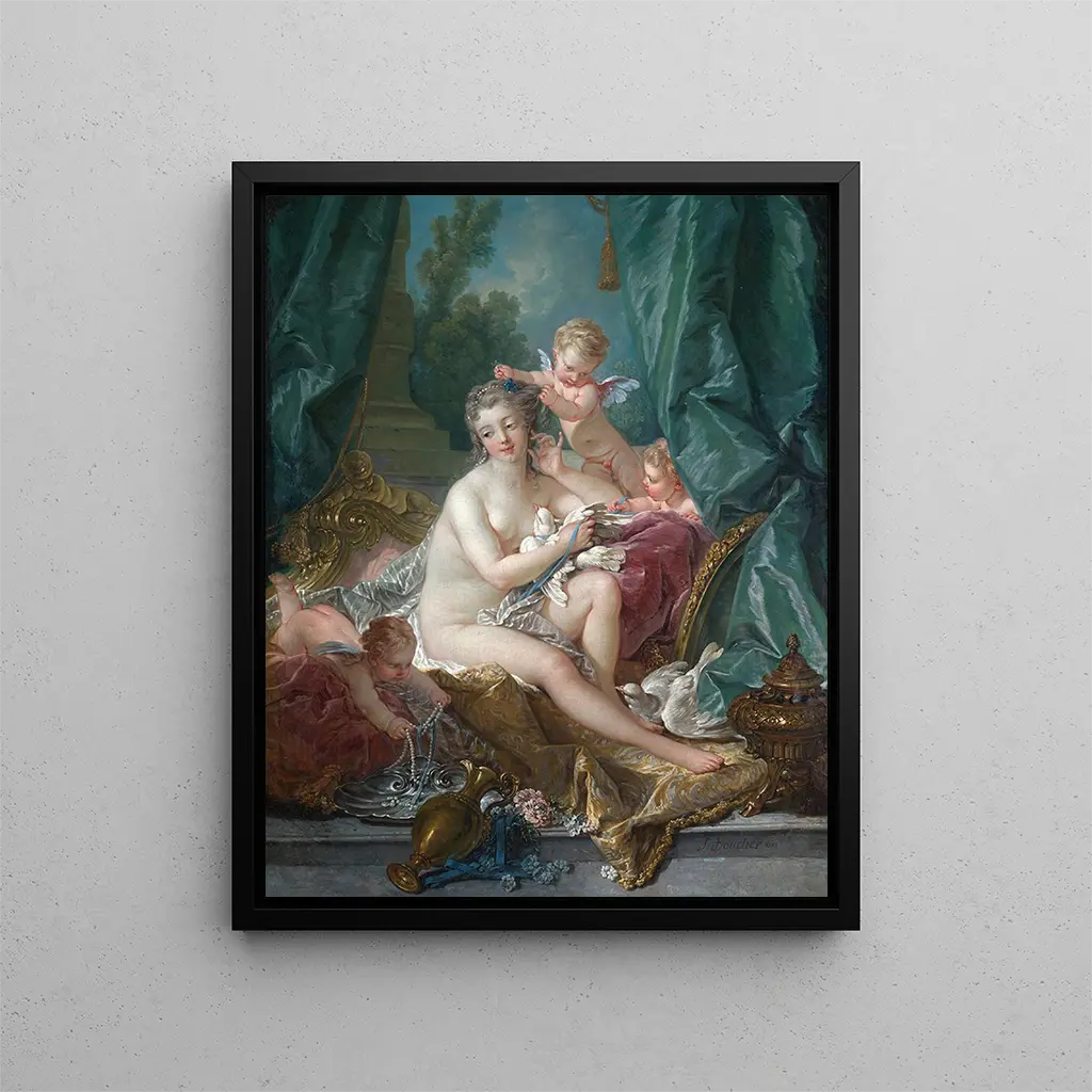 Reproduktion La Toilette de Vénus - François Boucher – Einführung, die fasziniert In der faszinierenden Welt der barocken Kunst hebt sich "La Toilette de Vénus" von François Boucher als ein ikonisches Werk hervor, das Schönheit und Sinnlichkeit verkörpert. Dieses Gemälde, das im 18. Jahrhundert entstand, ist eine Feier der Liebesgöttin Vénus, dargestellt in einem Moment von Intimität und Zartheit. Das Werk zieht den Blick durch seine harmonische Komposition und seine schillernden Farben an, die eine Traum- und Eleganzatmosphäre hervorrufen. Es lädt den Betrachter ein, in eine Welt einzutauchen, in der Ästhetik und Emotion aufeinandertreffen, und bietet so einen Einblick in die Anliegen und Bestrebungen einer Epoche, in der Kunst sowohl ein Spiegel der Gesellschaft als auch ein Fluchtmittel war. Stil und Einzigartigkeit des Werks Der Stil von François Boucher ist sofort erkennbar, geprägt von fließenden Linien und üppigen Formen. In "La Toilette de Vénus" vereinen sich die Anmut der Kurven und die Sanftheit der Pastelltöne, um eine Atmosphäre von Leichtigkeit und Raffinesse zu schaffen. Das Licht spielt eine zentrale Rolle, indem es das Gesicht von Vénus erleuchtet und die Textur der Kleidung und Drapierungen hervorhebt. Die feinen Details, wie Accessoires und dekorative Elemente, zeugen von einer Liebe zum Detail, die die Handschrift von Boucher ist. Die Komposition, die auf die Figur der Vénus fokussiert, wird durch die Präsenz von Nebenfiguren ausgeglichen, die eine erzählerische Dimension hinzufügen. Diese Elemente tragen dazu bei, eine intime und fesselnde Szene zu schaffen, in der Schönheit in ihrer ganzen Pracht gefeiert wird. Der Künstler und sein Einfluss François Boucher, geboren 1703, ist einer der einflussreichsten Maler des 18. Jahrhunderts und verkörpert den Rokoko-Stil mit unvergleichlicher Virtuosität. Sein Werk ist in einen künstlerischen Kontext eingebettet, in dem Liebe, Natur und Mythologie wiederkehrende Themen sind. Boucher verstand es, den Geist seiner Zeit einzufangen, indem er Sinnlichkeit und Leichtigkeit in seinen Kompositionen vereinte. Sein Einfluss reicht über seine eigene Epoche hinaus und inspiriert zahlreiche Künstler, die ihm folgten, sowohl in der Malerei als auch in anderen Kunstformen. Durch seine Werke hat er die Darstellung der