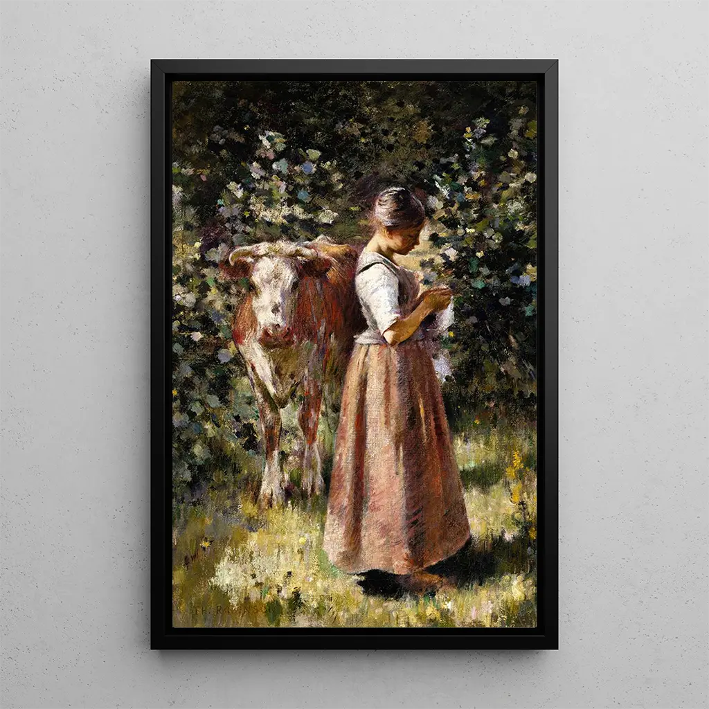 In "La vachère" fängt Theodore Robinson die Essenz einer idyllischen Szene voller Gelassenheit ein. Die Komposition hebt eine junge Frau hervor, die in einem schlichten Kleid eine Kuh in einer grünen Landschaft versorgt. Die sanften und natürlichen Farben, die von leuchtendem Grün bis zu warmem Braun reichen, schaffen eine beruhigende Atmosphäre. Die impressionistische Technik von Robinson, gekennzeichnet durch flüssige Pinselstriche und ein subtiles Licht, erweckt diese alltägliche Szene zum Leben und lädt den Betrachter ein, die Ruhe der Landschaft zu spüren. Dieses Gemälde ruft nicht nur die Schönheit der Natur hervor, sondern auch die Einfachheit und Harmonie des Landlebens.
