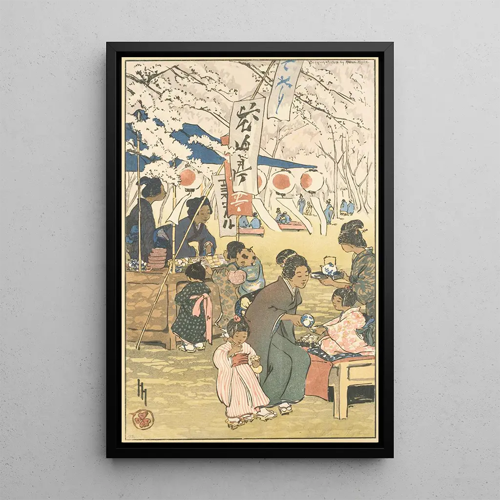 In "Le temps des fleurs à Tokyo" fängt Helen Hyde das Wesen eines flüchtigen Moments ein, in dem die schönheit der kirschblüten mit dem alltag verschmilzt. Die zarte komposition, mit ihren pastellfarbenen tönen und akzenten in leuchtendem rosa, evoziert eine atmosphäre von gelassenheit und kontemplation. Die figuren, oft in traditionellen kimonos gekleidet, verschmelzen harmonisch in dieser blumigen landschaft und schaffen eine poetische interaktion zwischen mensch und natur. Die aquarelltechnik, mit ihren subtilen nuancen, verstärkt die leichtheit der szene und lädt den betrachter ein, in diese idyllische vision Japans einzutauchen.
