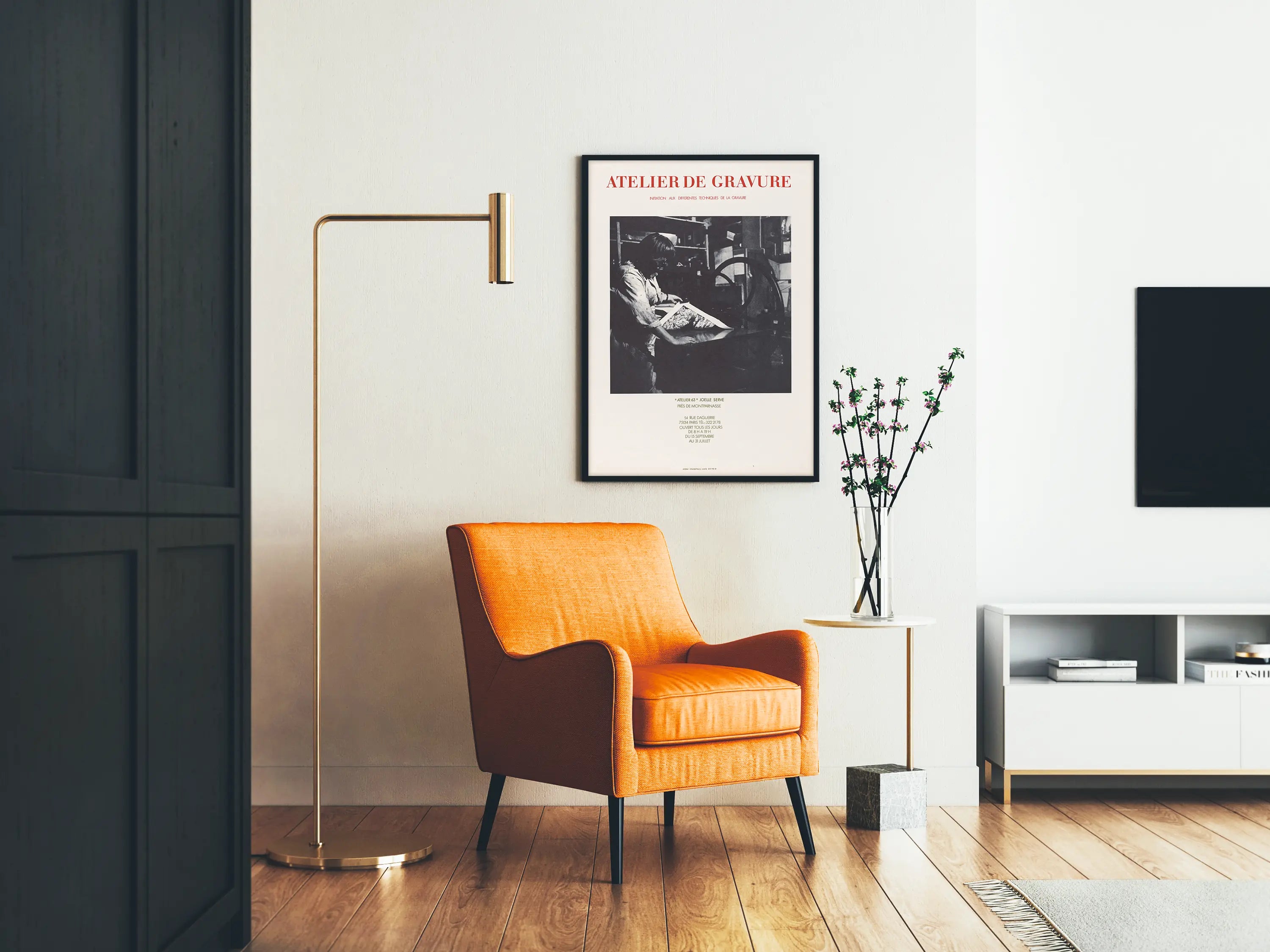 Durch seinen sowohl retro- als auch dokumentarischen Stil lässt sich dieses Plakat mühelos in verschiedene Einrichtungsstile integrieren, insbesondere in industrielle, Vintage- oder Bohème-Umgebungen. Es lenkt zudem die Aufmerksamkeit auf die Kunst der Gravur und lädt dazu ein, diese Ausdrucksform durch ein kraftvolles und aussagekräftiges Bild neu zu entdecken.