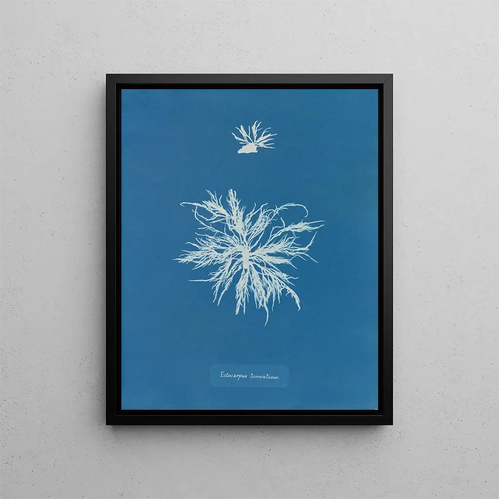 Reproduktion Ectocarpus tomentosus - Anna Atkins – Einführung fesselnd In der faszinierenden Welt der botanischen Kunst hebt sich das Werk "Ectocarpus tomentosus" von Anna Atkins durch seine Zartheit und Innovation hervor. Dieses ikonische Stück, das im 19. Jahrhundert geschaffen wurde, ist nicht nur eine visuelle Darstellung einer Meeresalge, sondern auch ein Zeugnis für die Schnittstelle zwischen Wissenschaft und Kunst. Anna Atkins, Pionierin der botanischen Fotografie, hat die vergängliche Schönheit der Natur mit avantgardistischen Techniken ihrer Zeit eingefangen. Beim Betrachten dieses Werks entdeckt man eine Welt, in der jedes Detail, jeder Farbton eine Geschichte erzählt, was diesen Kunstdruck zu einem wahren Meisterwerk macht. Stil und Einzigartigkeit des Werks Die Originalität von "Ectocarpus tomentosus" liegt in seinem einzigartigen Ansatz der botanischen Darstellung. Mit der Cyanotypie-Technik hat Anna Atkins natürliche Exemplare in beeindruckende Bilder verwandelt, bei denen Licht und Schatten eine wesentliche Rolle spielen. Der tiefblaue Farbton, der daraus entsteht, erinnert sowohl an das Meer als auch an den Himmel und schafft eine Atmosphäre der Ruhe und Kontemplation. Jede Alge wird mit größter Präzision reproduziert, was den Betrachter einlädt, die zarten Texturen und organischen Formen zu erkunden. Diese Wahl des Mediums, das sowohl wissenschaftlich als auch künstlerisch ist, veranschaulicht perfekt Atkins' Vision, die Schönheit der Natur zu verewigen und gleichzeitig zum botanischen Wissen beizutragen. Beim Betrachten dieses Werks spürt man eine tiefe Verbindung zur natürlichen Welt, als ob jedes Element eine Einladung ist, die Geheimnisse des Meereslebens zu erforschen. Der Künstler und sein Einfluss Anna Atkins, oft als eine der ersten Fotografinnen angesehen, prägte ihre Zeit durch ihren Mut und ihre Kreativität. Geboren 1799, lebte sie in einer Epoche, in der Frauen selten in wissenschaftlichen und künstlerischen Bereichen anerkannt wurden. Ihre Arbeit an "Ectocarpus tomentosus" und anderen ähnlichen Werken hat nicht nur den Weg für die botanische Kunst geebnet, sondern auch die Grundlagen der wissenschaftlichen Fotografie gelegt. Durch die Verbindung ihrer Liebe zur Botanik mit einem künstlerischen Ansatz hat Atkins die Wahrnehmung der Fotografie weiterentwickelt, die sie als ein vollwertiges Ausdrucksmittel betrachtet.