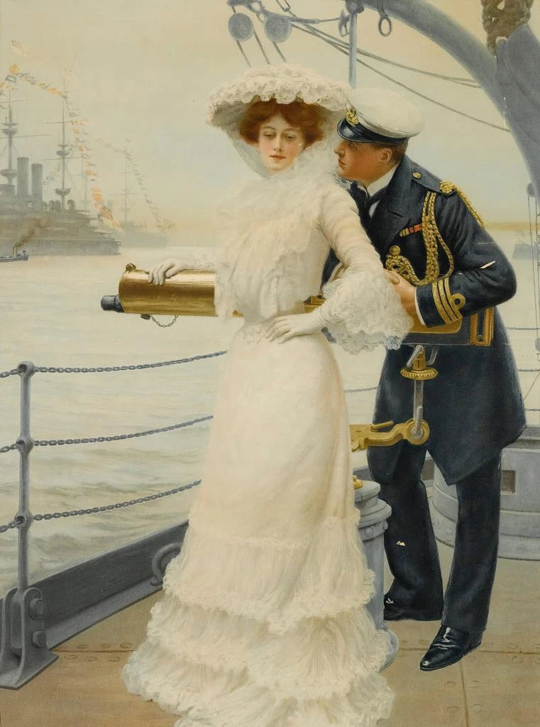 Das Werk zeichnet sich durch seinen realistischen Ansatz aus, typisch für die Englische Schule, die das Leben in seiner ganzen Pracht einfängt. Licht- und Schattenspiele sowie die Feinheit der Details zeugen von einer unbestreitbaren technischen Meisterschaft. Die Figuren, in einer ruhigen Haltung dargestellt, scheinen sich der Sanftheit eines Moment der Ruhe hinzugeben. Die gewählte Farbpalette, die sowohl sanft als auch warm ist, schafft eine ruhige Atmosphäre, die zum Entfliehen einlädt. Jedes Element der Komposition, von der Kleidung der Figuren bis zu den umgebenden Gegenständen, trägt dazu bei, dieses Gefühl von Ruhe und Kontemplation zu verstärken. Die Fähigkeit des Künstlers, Emotionen durch Farbe und Licht hervorzurufen, macht dieses Werk zu einer wahren Einladung zum Träumen.