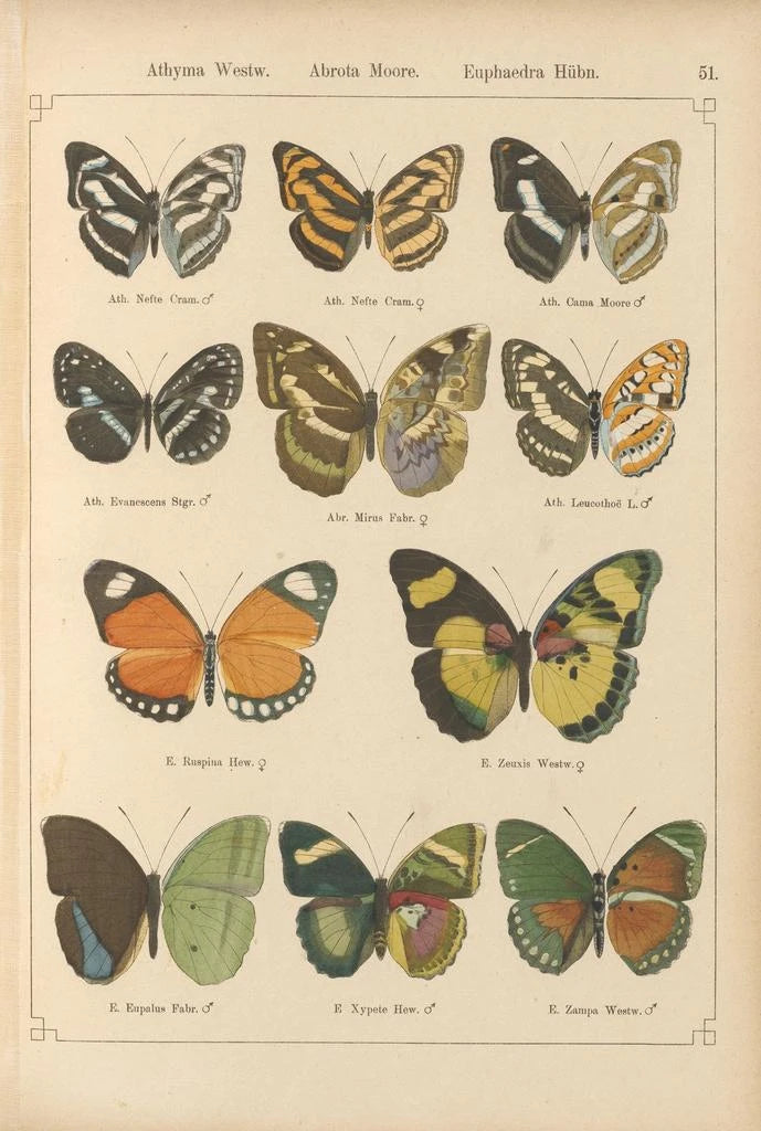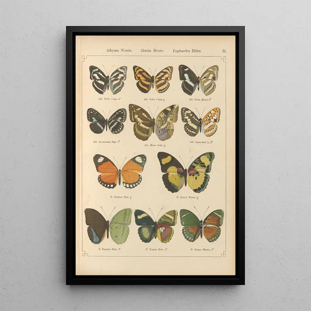 Die "Papillons exotiques Pl051" von Otto Staudinger sind eine Feier der Vielfalt und Schönheit der Arten. Dieses Werk, reich an Details, zeigt lebendige Schmetterlinge, die fast von der Leinwand zu fliegen scheinen. Die Präzision der Linien und die Feinheit der Farben schaffen eine fröhliche und dynamische Atmosphäre, die den Betrachter einlädt, die Pracht der Natur zu bewundern. Jeder Schmetterling mit seinen einzigartigen Mustern erzählt eine Geschichte von Metamorphose und Zerbrechlichkeit und bietet ein fesselndes visuelles Erlebnis, das den Betrachter in eine verzauberte Welt entführt.