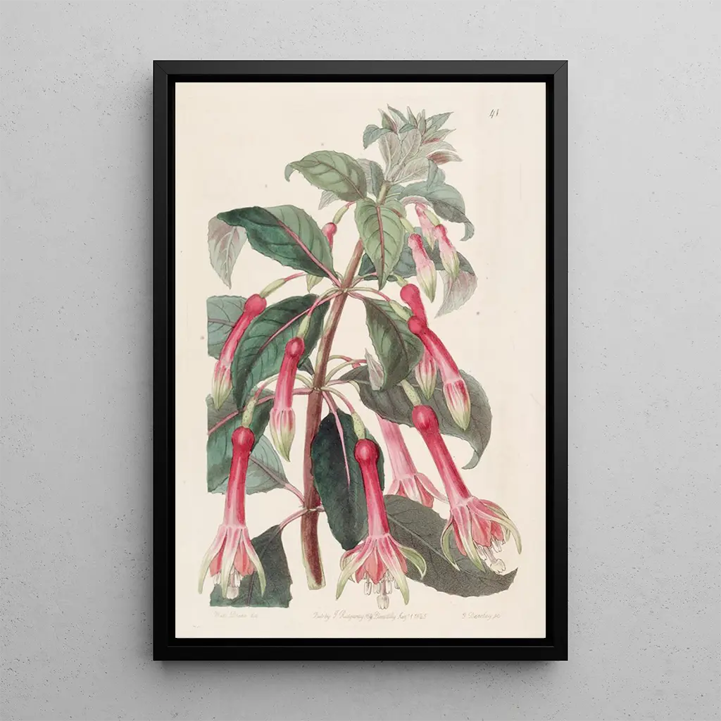 Die kunstdruck Fuchsia mit gezackten Blättern entführt uns in eine florale Welt, in der die leuchtenden Töne von Rosa und Violett harmonisch verschmelzen. Die zarten Blumen, die wie Laternen hängen, ziehen den Blick auf sich und laden zum Staunen ein. Die Aquarelltechnik, die von Sydenham Edwards verwendet wird, fängt die Leichtigkeit der Blütenblätter ein und verleiht den umgebenden gezackten Blättern Tiefe. Die Atmosphäre, die dieses Werk ausstrahlt, ist sowohl fröhlich als auch beruhigend und erinnert an einen üppigen Garten, in dem die Natur blüht.