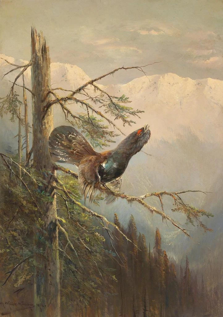Deutscher Künstler des 19. Jahrhunderts, Moritz Müller ist bekannt für seine realistischen Darstellungen wilder Tiere, die eine tiefe Bewunderung für die Natur zeigen. Beeinflusst von der romantischen Bewegung, bemüht er sich, das Wesen seiner Motive einzufangen, oft mit Fokus auf ihr natürliches Verhalten. Seine Arbeiten spiegeln eine Zeit wider, in der die Beobachtung der Fauna für Künstler immer wichtiger wurde, und zeigen ein wachsendes Interesse an Naturschutz und der Schönheit der natürlichen Welt. Müllers Werke, darunter der große Tetra in Balz, sind nicht nur Zeugnisse seines Talents, sondern auch Reflexionen über die Beziehung zwischen Mensch und Natur.