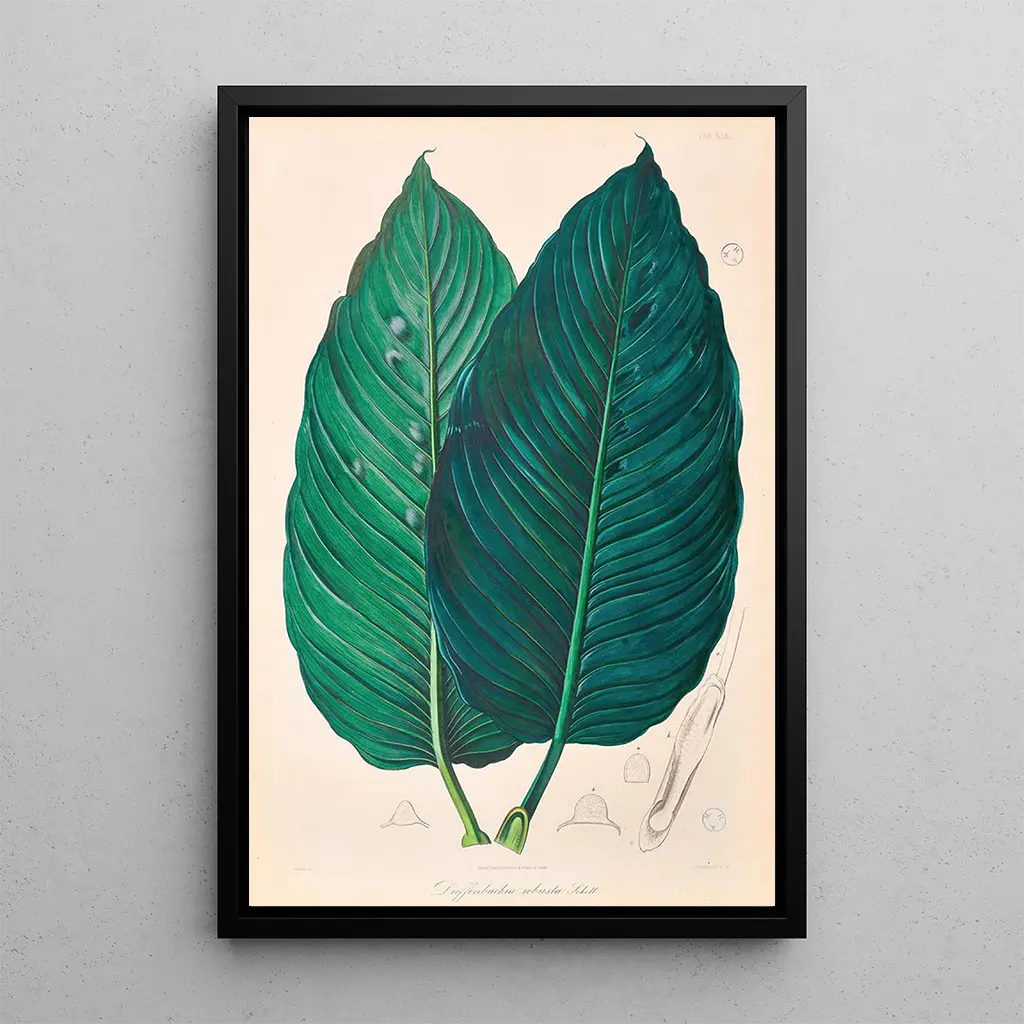 Icones Aroidearum Pl22 : eine bezaubernde florale Symphonie Das Werk "Icones Aroidearum Pl22" von Heinrich Wilhelm Schott ist eine Feier der floralen Vielfalt. Diese botanische Illustration, mit außergewöhnlicher Präzision gefertigt, offenbart Formen und Farben, die das Auge fesseln. Die leuchtenden Töne, von üppigem Grün bis zu tiefem Violett, vermitteln ein Gefühl von Frische und Vitalität. Die Aquarelltechnik, mit Feinfühligkeit angewendet, ermöglicht es, Licht und Textur der Pflanzen fast greifbar darzustellen. Jedes Detail, jeder Schatten, erzählt eine Geschichte und lädt den Betrachter ein, die faszinierende Welt der Araceae zu erkunden. Heinrich Wilhelm Schott: ein Künstler im Dienste der Wissenschaft Heinrich Wilhelm Schott, geboren 1794, gilt als einer der einflussreichsten botanischen Illustratoren seiner Zeit. Sein Schwerpunkt liegt vor allem auf tropischen Pflanzen, insbesondere aus der Familie der Araceae. Schott war ein Pionier in der Verwendung von kunstdrucks zur Dokumentation und Feier der Biodiversität. Seine Werke sind das Ergebnis einer Leidenschaft für die Botanik und dem Wunsch, die Schönheit der Natur mit der Welt zu teilen. Durch seine Illustrationen vereinte er wissenschaftliche Genauigkeit mit künstlerischer Sensibilität und hinterließ ein nachhaltiges Erbe im Bereich der botanischen Illustration. Eine dekorative Anschaffung mit vielfältigen Vorzügen Der kunstdruck von "Icones Aroidearum Pl22" stellt eine außergewöhnliche dekorative Ergänzung für jeden Raum dar. Ob im Büro, im Esszimmer oder im Schlafzimmer, dieses Bild bringt einen Hauch von Natur und Eleganz in den Raum. Die Druckqualität sorgt für eine bemerkenswerte Farbtreue und Detailgenauigkeit des Originalwerks, sodass seine Schönheit voll zur Geltung kommt. Mit seinem ästhetischen Reiz wird diese Leinwand zum echten Blickfang in Ihrer Inneneinrichtung und schafft eine beruhigende und inspirierende Atmosphäre. Gönnen Sie sich dieses Werk, um Ihre Umgebung mit einem einzigartigen floralen Akzent zu bereichern.