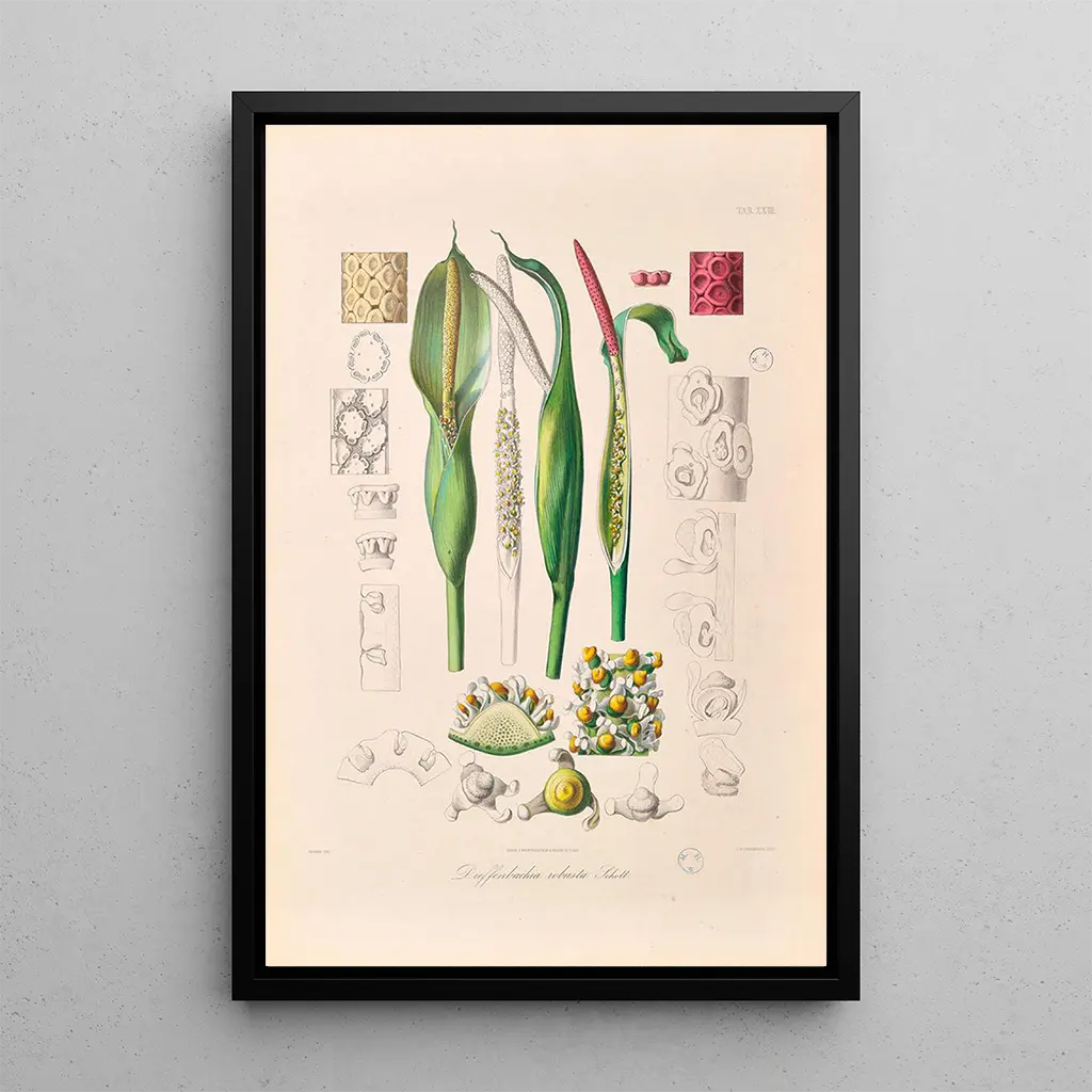 Icones Aroidearum Pl23 : eine Feier der Biodiversität Das Werk "Icones Aroidearum Pl23" von Heinrich Wilhelm Schott ist eine wahre Hommage an die Vielfalt der tropischen Flora. Diese botanische illustration, mit akribischer Präzision gefertigt, enthüllt faszinierende Details der Aroiden. Die lebendigen Farben, von üppigem Grün bis hin zu leuchtenden Nuancen von Violett und Gelb, schaffen eine lebendige und dynamische Atmosphäre. Die verwendete Gravurtechnik ermöglicht es, die Textur der Blätter und die Zartheit der Blumen einzufangen, und lädt den Betrachter ein, in die faszinierende Welt dieser Pflanzenarten einzutauchen. Jedes Element der Komposition scheint eine Geschichte zu erzählen und versetzt uns ins Herz der tropischen Regenwälder. Heinrich Wilhelm Schott : der Pionier der illustrierten Botanik Heinrich Wilhelm Schott, Botaniker und Illustrator des 19. Jahrhunderts, spielte eine entscheidende Rolle bei der Erforschung und Klassifikation der Aroiden. Geboren 1794 in Österreich, widmete er sein Leben der Erforschung und Dokumentation der tropischen Flora, beeinflusst von den botanischen Expeditionen seiner Zeit. Schott arbeitete mit zahlreichen Wissenschaftlern zusammen und trug zur Erstellung mehrerer Referenzwerke über Pflanzen bei. Sein künstlerischer Ansatz, der Wissenschaft und Ästhetik vereint, trug dazu bei, die botanische Illustration zu popularisieren und die Schönheit der Natur einem breiten Publikum zugänglich zu machen. Sein Erbe lebt durch seine Werke weiter, die weiterhin Hobbybotaniker und Kunstliebhaber inspirieren. Eine dekorative Anschaffung mit vielfältigen Vorzügen Die kunstdruck von "Icones Aroidearum Pl23" ist ein dekoratives Stück, das jeden Raum bereichern kann, sei es ein Wohnzimmer, ein Büro oder ein Schlafzimmer. Die Druckqualität und die Farbtreue machen ihn zur idealen Wahl für alle, die ihrer Einrichtung einen Hauch Natur verleihen möchten. Dieses Bild, mit seinem unbestreitbaren ästhetischen Reiz, zieht den Blick auf sich und weckt Neugier. Durch die Integration dieses Leinwandbildes in Ihre Dekoration bieten Sie nicht nur ein Kunstwerk, sondern auch einen Dialog über Biodiversität und die Schönheit der Pflanzenwelt. Es ist eine Anschaffung, die Kultur und Dekoration verbindet – perfekt für Botaniker und Kunstliebhaber.