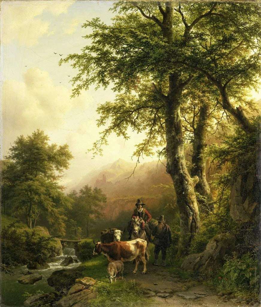 Reproduktion Italienische Landschaft - Barend Cornelis Koekkoek – Fesselnde Einführung In der Welt der Kunst gelingt es einigen Gemälden, das Wesen eines Ortes so einzufangen, dass sie Fenster zu einer anderen Zeit und einem anderen Raum werden. "Italienische Landschaft - Barend Cornelis Koekkoek" ist eines dieser Werke. Es weckt nicht nur die Schönheit italienischer Landschaften, sondern auch eine Atmosphäre voller Gelassenheit und Traum. Dieses Gemälde, zugleich zart und majestätisch, versetzt den Betrachter ins Herz einer lebendigen Natur, in der jedes Detail sorgfältig durchdacht wurde, um ein unvergessliches visuelles Erlebnis zu bieten. Das Werk von Koekkoek, mit seinen Farbnuancen und seinem subtilen Lichtspiel, lädt uns ein, eine Welt zu erkunden, in der die Natur herrscht und der Mensch, obwohl präsent, nur ein Gast in diesem weiten Gemälde ist. Stil und Einzigartigkeit des Werks Der Stil von Barend Cornelis Koekkoek zeichnet sich durch seine Fähigkeit aus, Realismus und Romantik zu verbinden. In "Italienische Landschaft" gelingt es dem Künstler, eine Atmosphäre zu schaffen, die sowohl friedlich als auch dynamisch ist, wobei das Licht eine zentrale Rolle spielt. Die strahlend blauen Himmel vermischen sich mit zart gemalten Wolken, während das üppige Grün der italienischen Hügel sich bis zum Horizont erstreckt. Jedes Element des Gemäldes, von Bäumen bis zu Flüssen, wird mit einer Präzision dargestellt, die tiefen Respekt vor der Natur zeigt. Koekkoek verwendet Maltechniken, die seiner Landschaft Leben einhauchen und die leichte Brise, die über die Felder zu wehen scheint, fast fühlbar machen. Dieses Gemälde beschränkt sich nicht darauf, einen Ort darzustellen; es evoziert ein Gefühl, eine sensorische Erfahrung, die uns mit der Schönheit der natürlichen Welt verbindet. Der Künstler und sein Einfluss Barend Cornelis Koekkoek, eine ikonische Figur des 19. Jahrhunderts, wird oft für seine Meisterschaft in der Landschaftsmalerei anerkannt. Ursprünglich aus den Niederlanden stammend, konnte er die künstlerischen Einflüsse seiner Zeit aufnehmen und gleichzeitig einen eigenen Stil entwickeln. Sein Werk hat die romantische Bewegung maßgeblich geprägt, in der die Natur in ihrer ganzen Pracht gefeiert wird. Koekkoek hat sich als Meister der Landschaft etabliert und viele nachfolgende Künstler inspiriert, die seine Spuren verfolgt haben. Seine Leidenschaft für