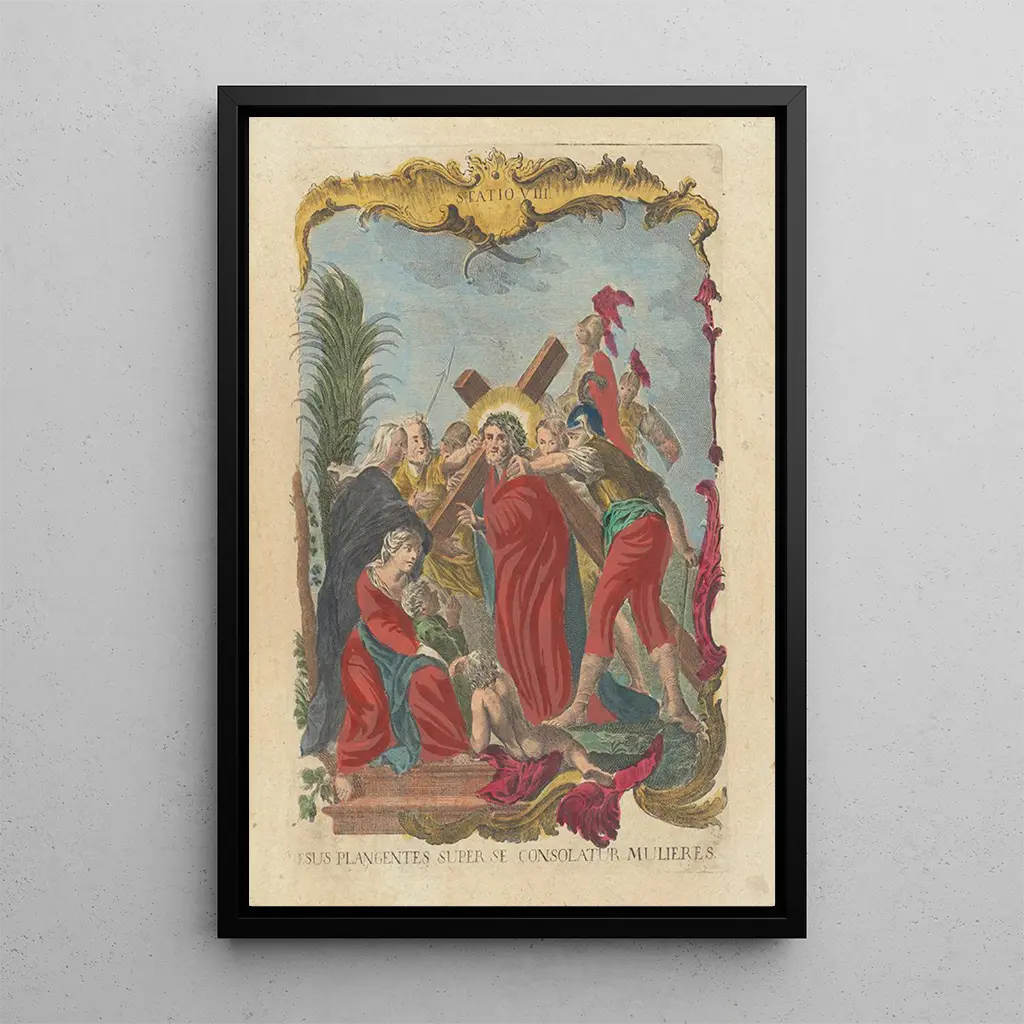 In dieser bewegenden kunstdruck-Reproduktion wird Jesus dargestellt, wie er die Frauen tröstet, die um seine bevorstehende Passion weinen. Die sanften Farben und die berührenden Ausdrücke der Figuren schaffen eine Atmosphäre von Zärtlichkeit und Mitgefühl. Die Technik der Famille Remondini, mit ihren feinen Details und Lichtspielen, hebt die Tiefe der menschlichen Emotionen hervor. Diese Szene, zugleich ergreifend und tröstlich, lädt den Betrachter ein, den Schmerz und die Hoffnung zu spüren, die von diesem biblischen Moment ausgehen.