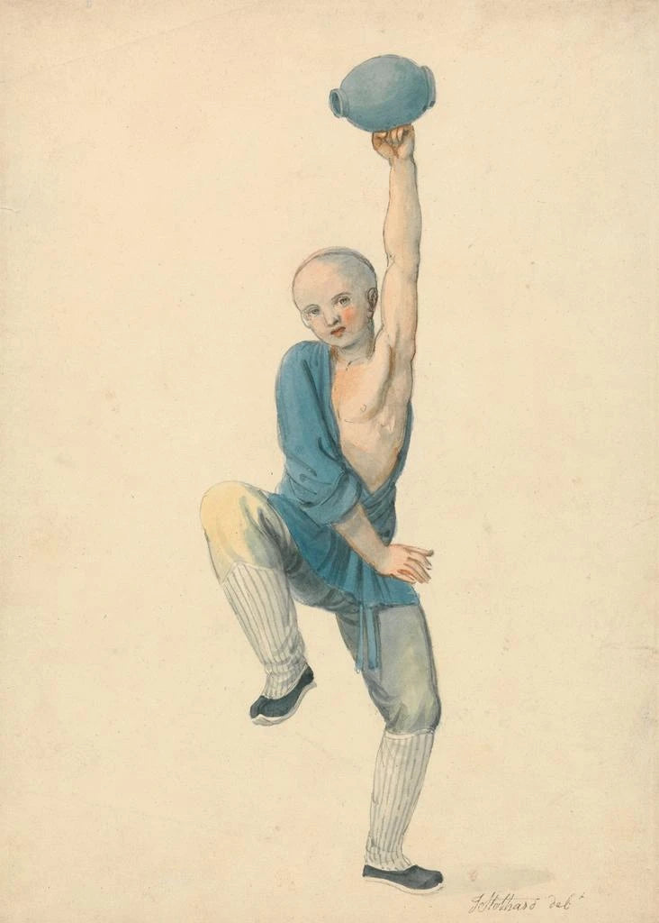 In diesem fesselnden Werk präsentiert Thomas Stothard einen jungen Chinesen, dessen träumerischer Blick und zarte Haltung eine zerbrechliche Schönheit hervorrufen. Die sanften Pastellfarben, verbunden mit Lichtakzenten, schaffen eine ruhige und kontemplative Atmosphäre. Die Technik von Stothard, die Aquarell und Gravur kombiniert, erweckt dieses Gemälde zum Leben und verleiht jedem Detail, vom Stoff des Kleides bis zum subtilen Lächeln des jungen Mannes, eine große Feinheit. Das Werk scheint den Betrachter einzuladen, in eine Welt voller Sanftheit und Flucht zu tauchen, in der Unschuld im Mittelpunkt steht.