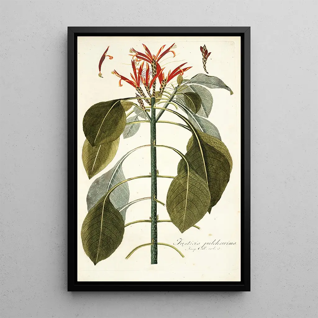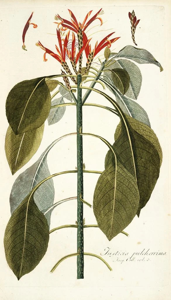 Die reproduction von Justicia pulcherrima entführt uns in eine lebendige Welt, in der die Natur mit Brillanz zum Ausdruck kommt. Die Blütenblätter in leuchtendem Rot und Orangetönen heben sich vor einem grünen Hintergrund ab und schaffen einen beeindruckenden Kontrast. Die Aquarelltechnik, die Nikolaus Joseph Freiherr von Jacquin verwendete, ermöglicht es, die Zartheit der Blumen einzufangen und gleichzeitig eine außergewöhnliche Helligkeit zu bieten. Die Atmosphäre, die dieses Werk ausstrahlt, erinnert an die Wärme der Tropen und lädt zur Betrachtung der natürlichen Schönheit ein.