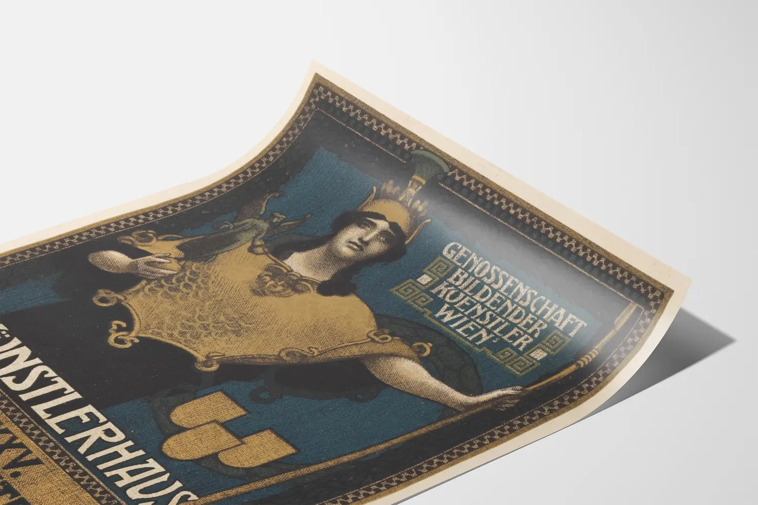 Entdecken Sie dieses außergewöhnliche Jugendstil-Poster, ideal für eine originelle und anspruchsvolle Wanddekoration. Es zeigt eine weibliche Figur mit Helm und goldener Rüstung, die eine Lanze hält, und ist eine Hommage an die jährlichen Ausstellungen der Maler und Bildhauer der Wiener Genossenschaft (Genossenschaft Bildender Künstler Wien). Die Komposition verbindet harmonisch tiefe Töne von Blau, Schwarz und Gold, die diesem Plakat einen zeitlosen Charme und eine starke visuelle Präsenz für ein elegantes Interieur verleihen. Der kunstvoll gestaltete Rahmen betont die typische Ästhetik des frühen 20. Jahrhunderts und macht dieses Werk zu einem echten Wandkunstobjekt, das Wohnzimmer, Büros oder kulturelle Räume verschönert. Dieses auf Papier gedruckte Bild hebt einen historischen Kunststil mit stilisierter gotischer Schrift hervor, die die Wiener Kunsttradition widerspiegelt. Perfekt als Wandbild geeignet, bietet diese Illustration eine Wanddekoration, die Charakter und Authentizität in die Wände bringt und gleichzeitig das europäische Kulturerbe dieser Epoche widerspiegelt. Mit der Wahl dieses Posters für Ihr Zuhause setzen Sie auf ein ikonisches Dekorationsstück, das Liebhaber alter Kunst und Fans von Vintage-Grafikdesign begeistern wird.