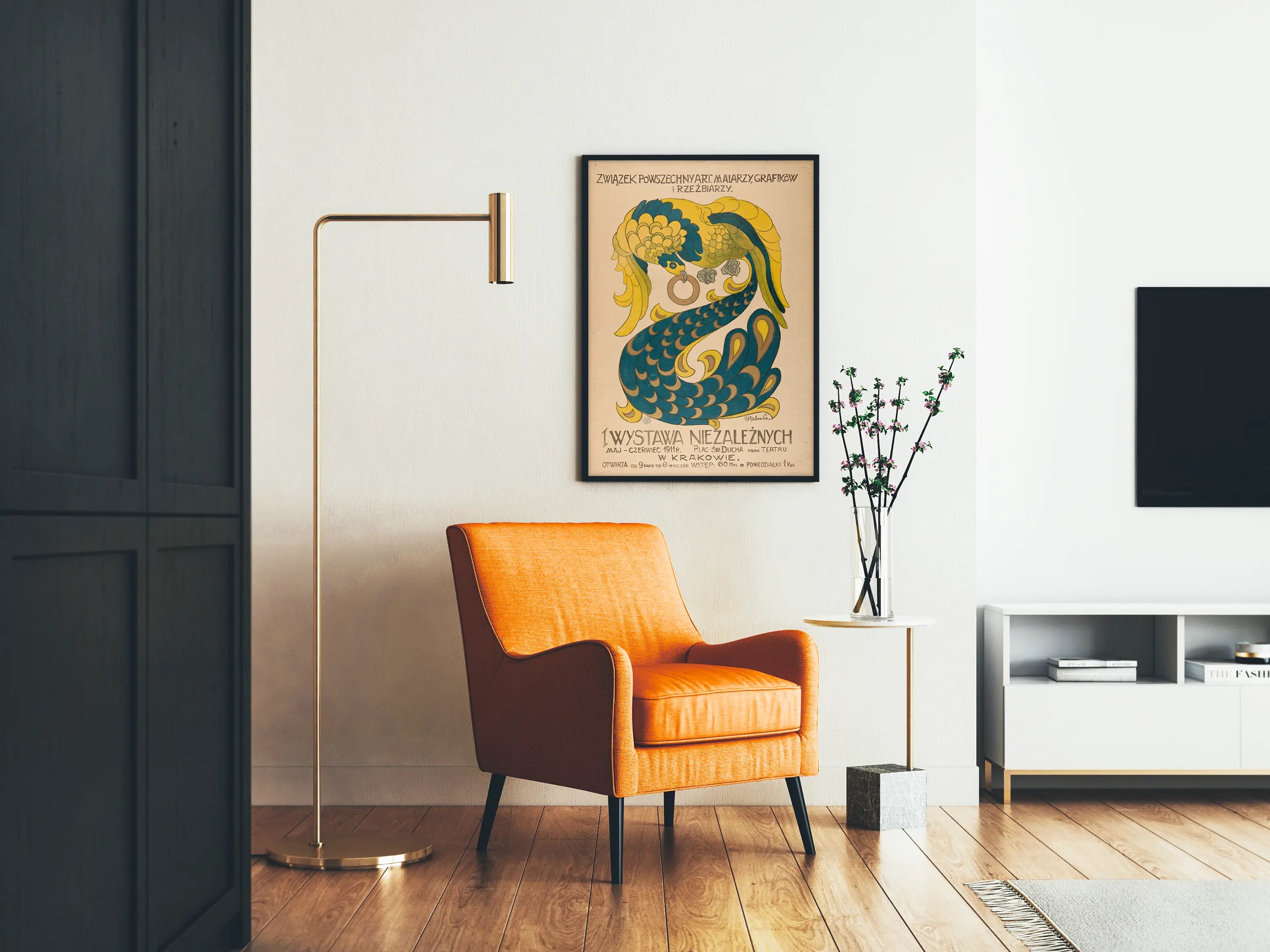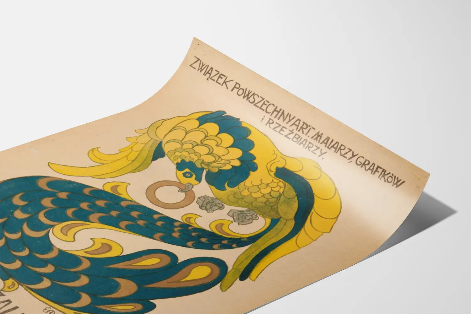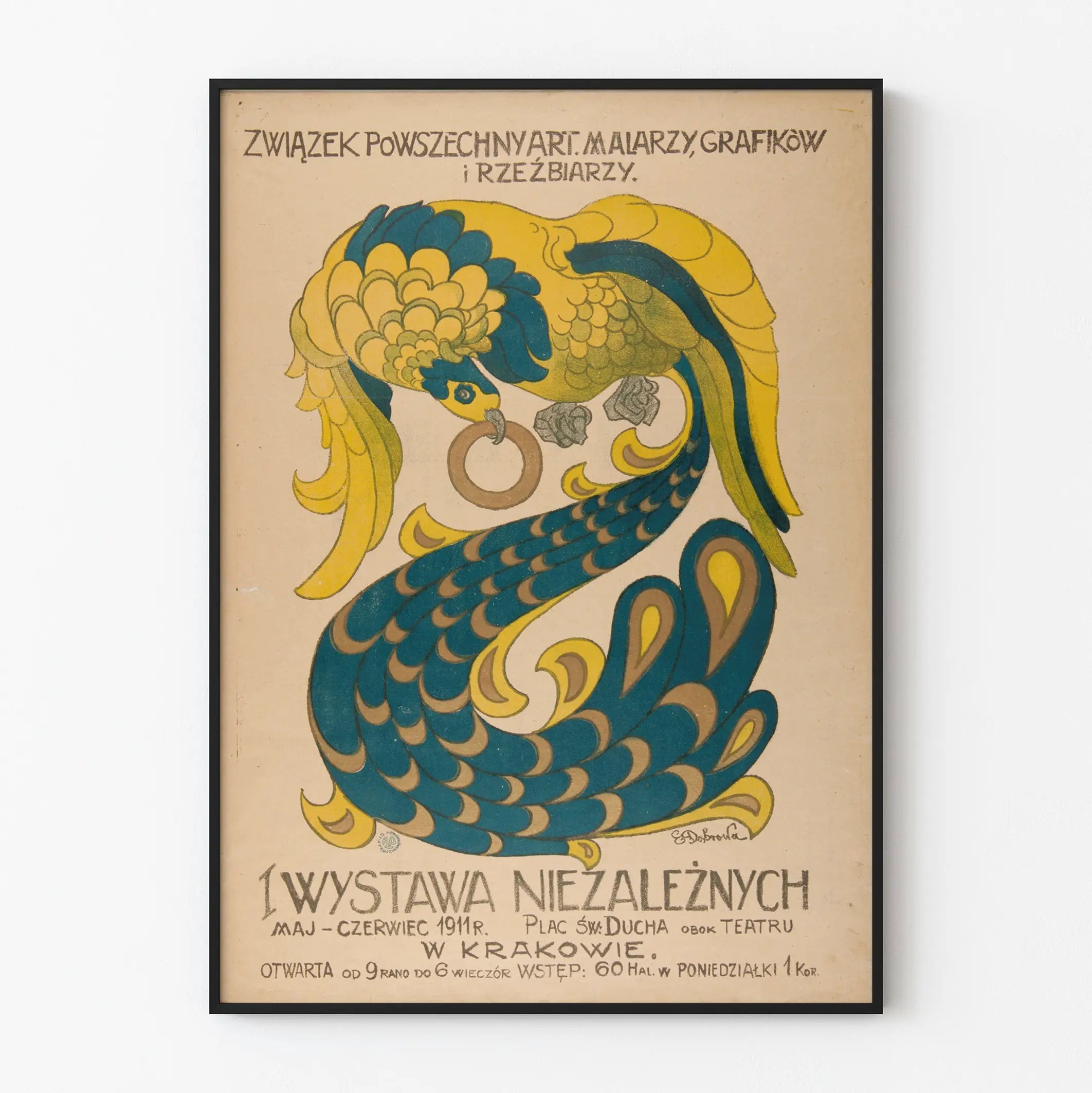 Dieses Vintage-Poster stellt ein typisches Werk des Art Déco dar, das einen stilisierten Vogel in den Farben Gelb, Blau und Grün zeigt, ausgeführt mit geometrischen Formen und organischen Mustern, die zu einer anspruchsvollen Wanddekoration einladen. Es kündigt die erste Ausstellung unabhängiger Künstler an, die 1911 in Krakau organisiert wurde, mit Malern, Grafikern und Bildhauern, und zeichnet sich durch sein einzigartiges Grafikdesign und seine alte Ästhetik aus, die die Geschichte der polnischen Kunst widerspiegeln.